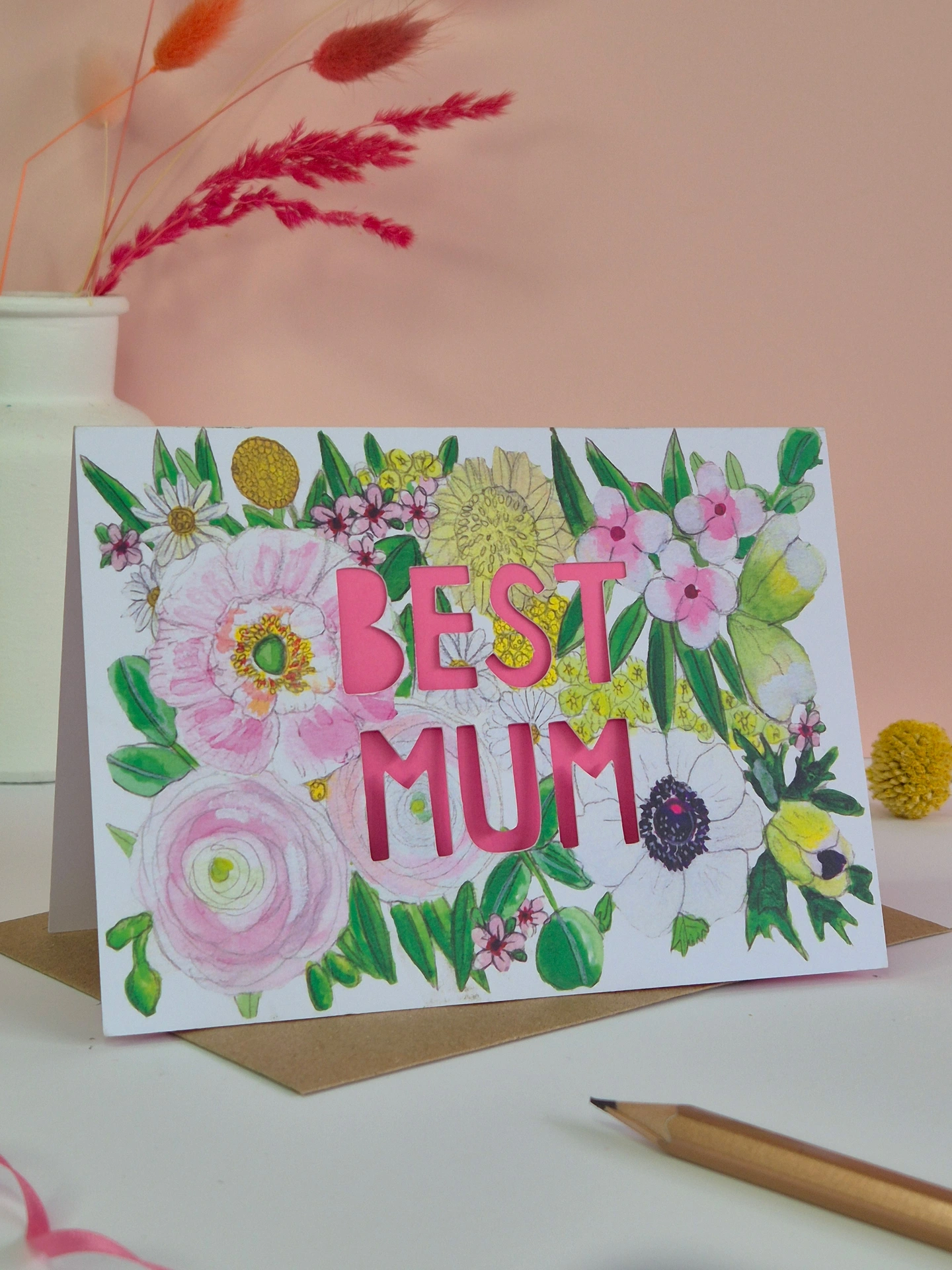 Coupled with my bright watercolour florals, this white based card, is customised with a 'Best Mum' cut out in paper cut letters and backed with pink liner.