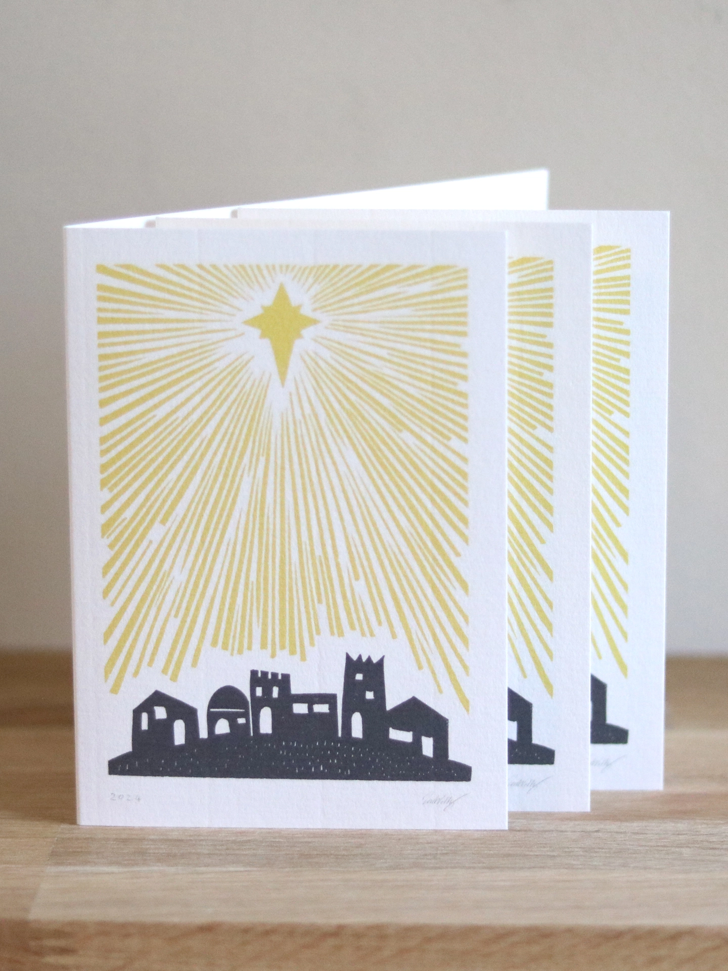 A pack of 3 premium A6 Christmas cards, featuring a digital reproduction of an original linocut print of Bethlehem.