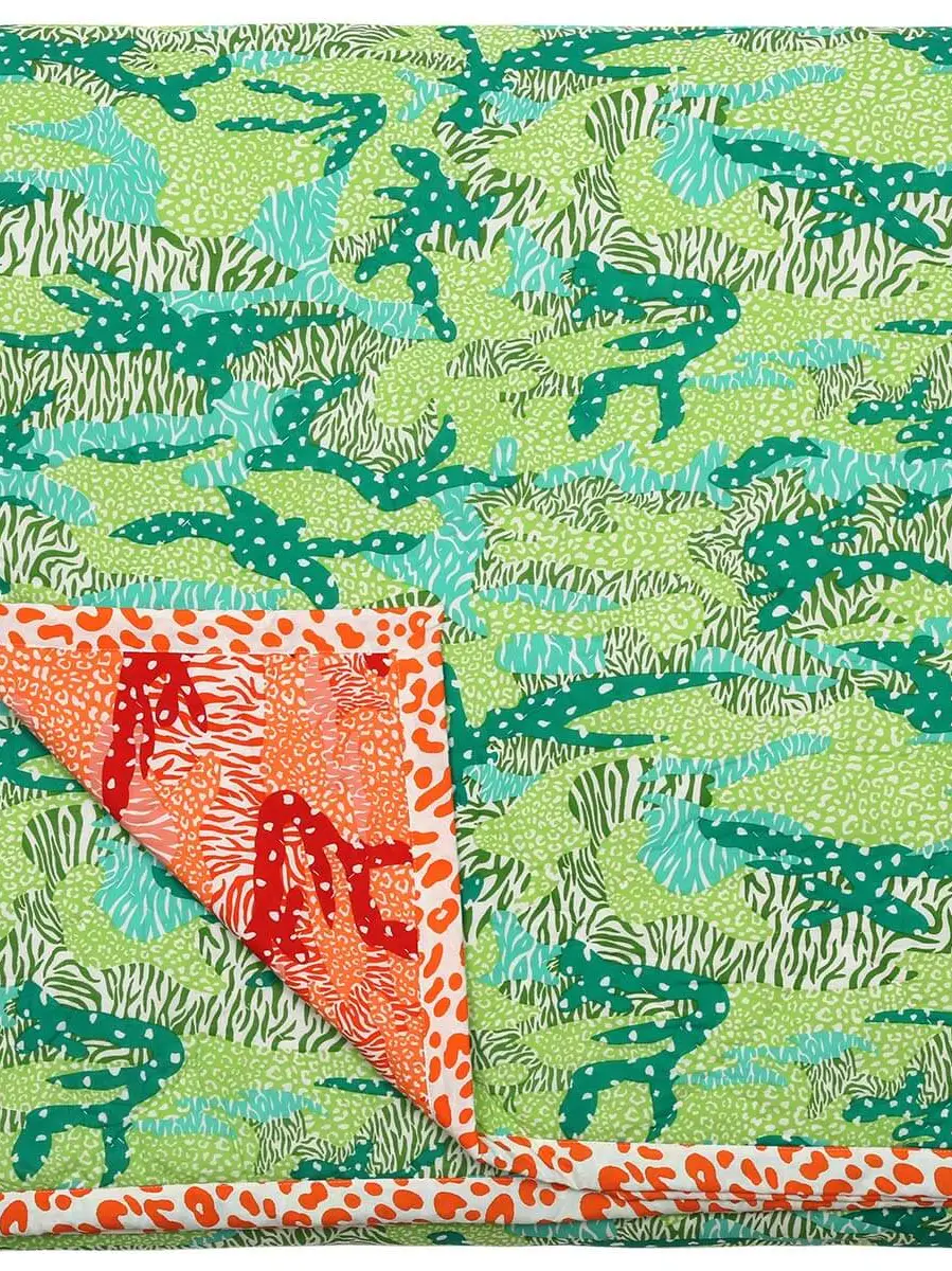 Inspired by 'big cats' hiding in the jungle, this vibrant 100% cotton quilt is hand screen printed with tiger stripes and leopard spots within a camo pattern to create a unique design combining classic animal and camouflage prints.