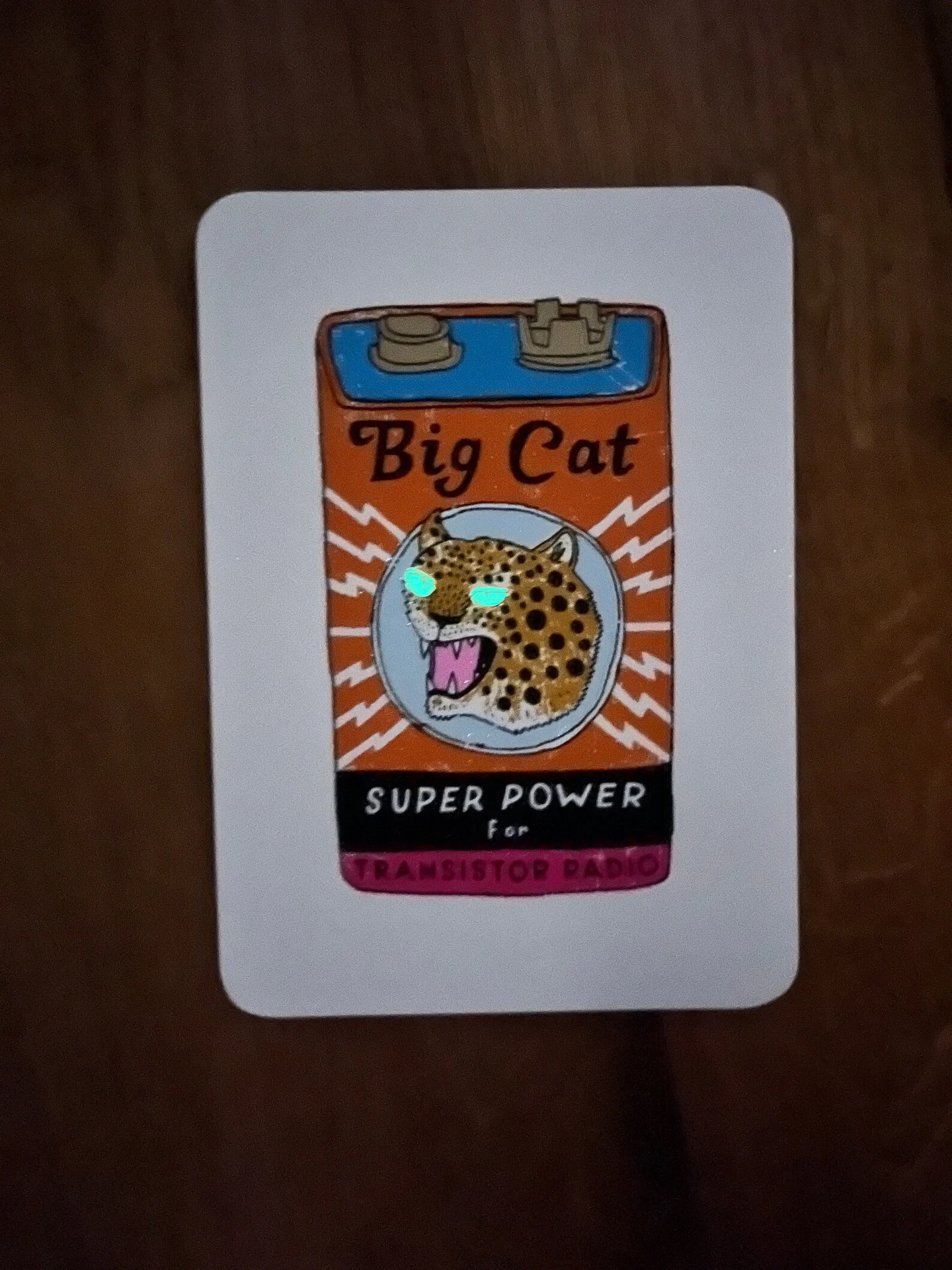 A handmade screen print of a (made up) vintage battery featuring a slightly angry looking leopard…his eyes glow in the dark