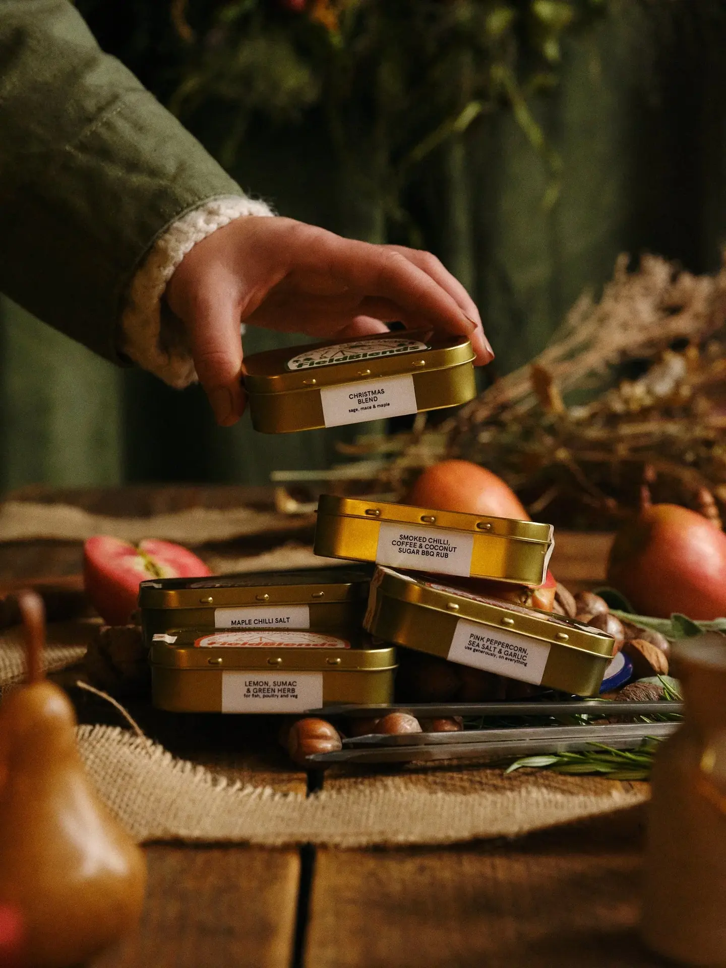 Christmas Blend: Our Christmas blend is inspired by nostaglic herby flavours of roasted Christmas dinners with organic sage, rosemary and onion being prominent. Organic maple sugar brings a luxury sweetness, and heady aromas of mace and clove pop up with an aromatic zing. Presented in a limited edition festive tin. Perfect for seasoning up pork or veggie stuffing, slathering on a big bird, on roasted root veg and, of course, potatoes.