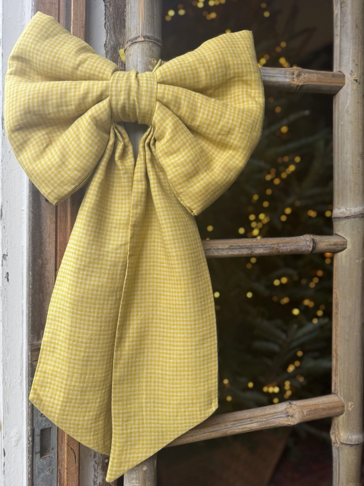 All of our linen bows are made using very high quality, 100% EU tumbled linens, which means they are beautifully slubby and soft. This bow being made using a yellowApprox Size(cm): Width 35 Length 65 gingham linen and threaded with velvet ribbon for hanging. Handmade in Suffolk.