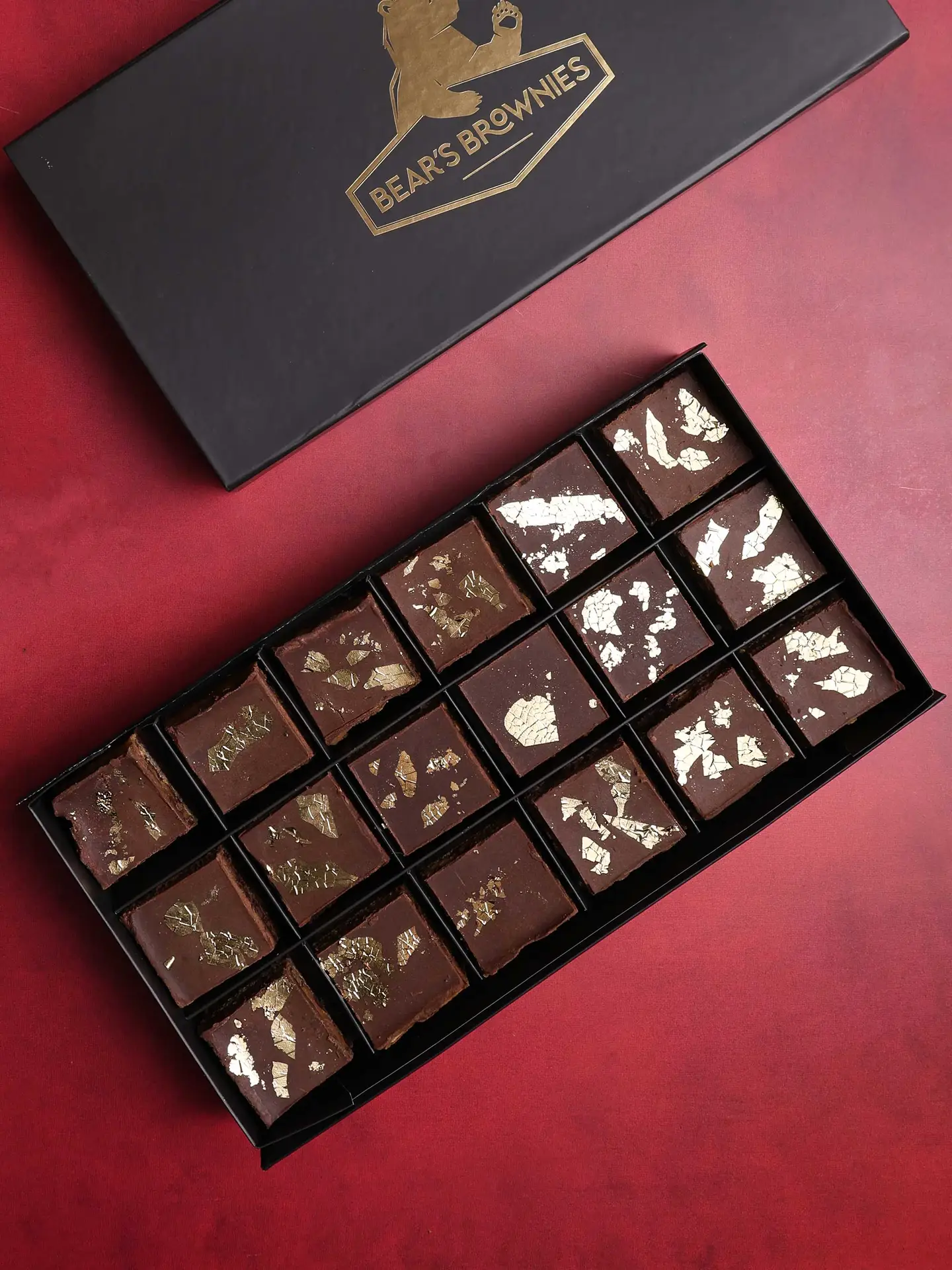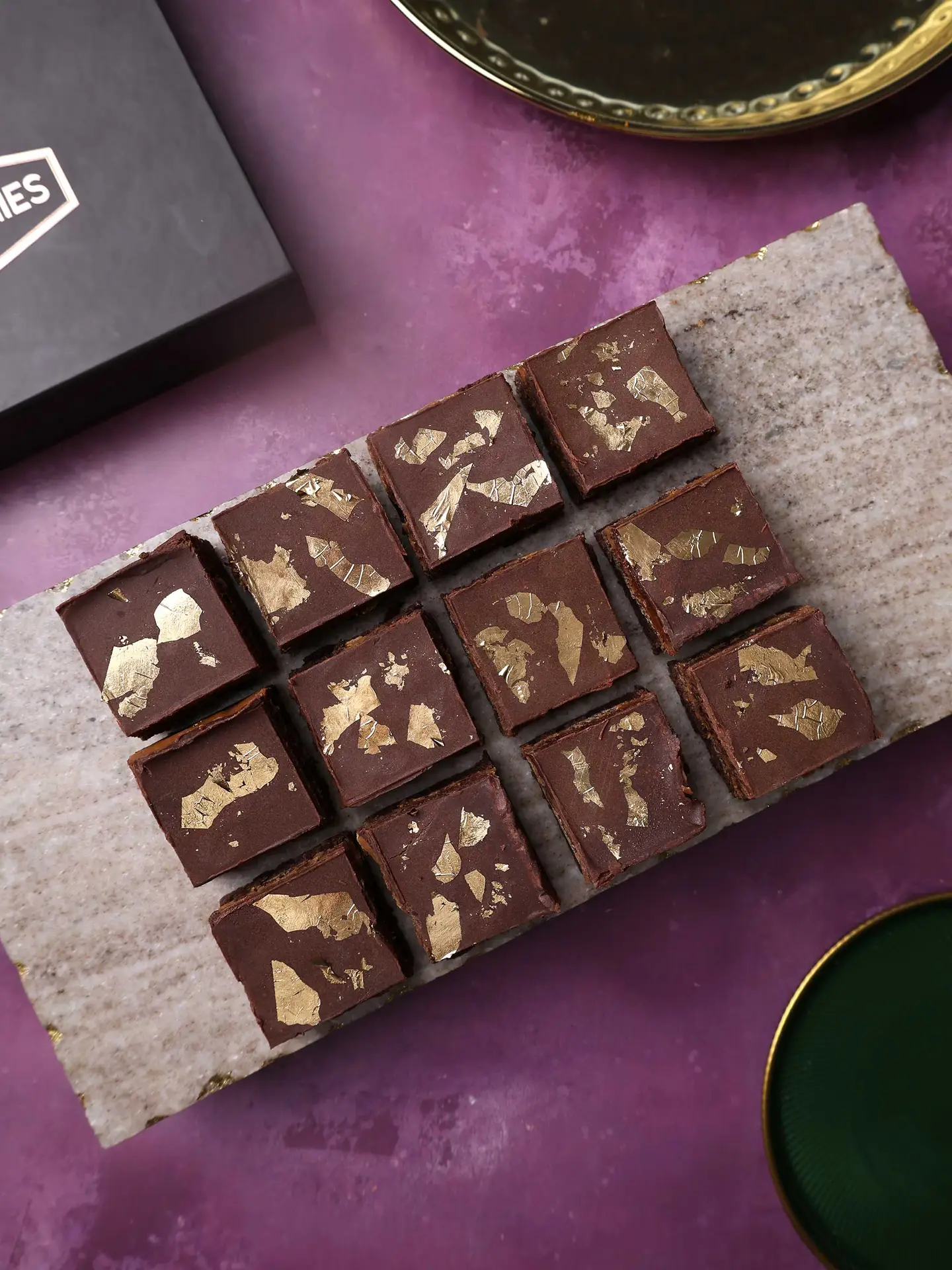 The ultimate brownie! Our chocolate luxury brownies with a caramel layer, finished with a dark chocolate ganache and gold leaf. You will never find a more decadent brownie – it really is gold standard!