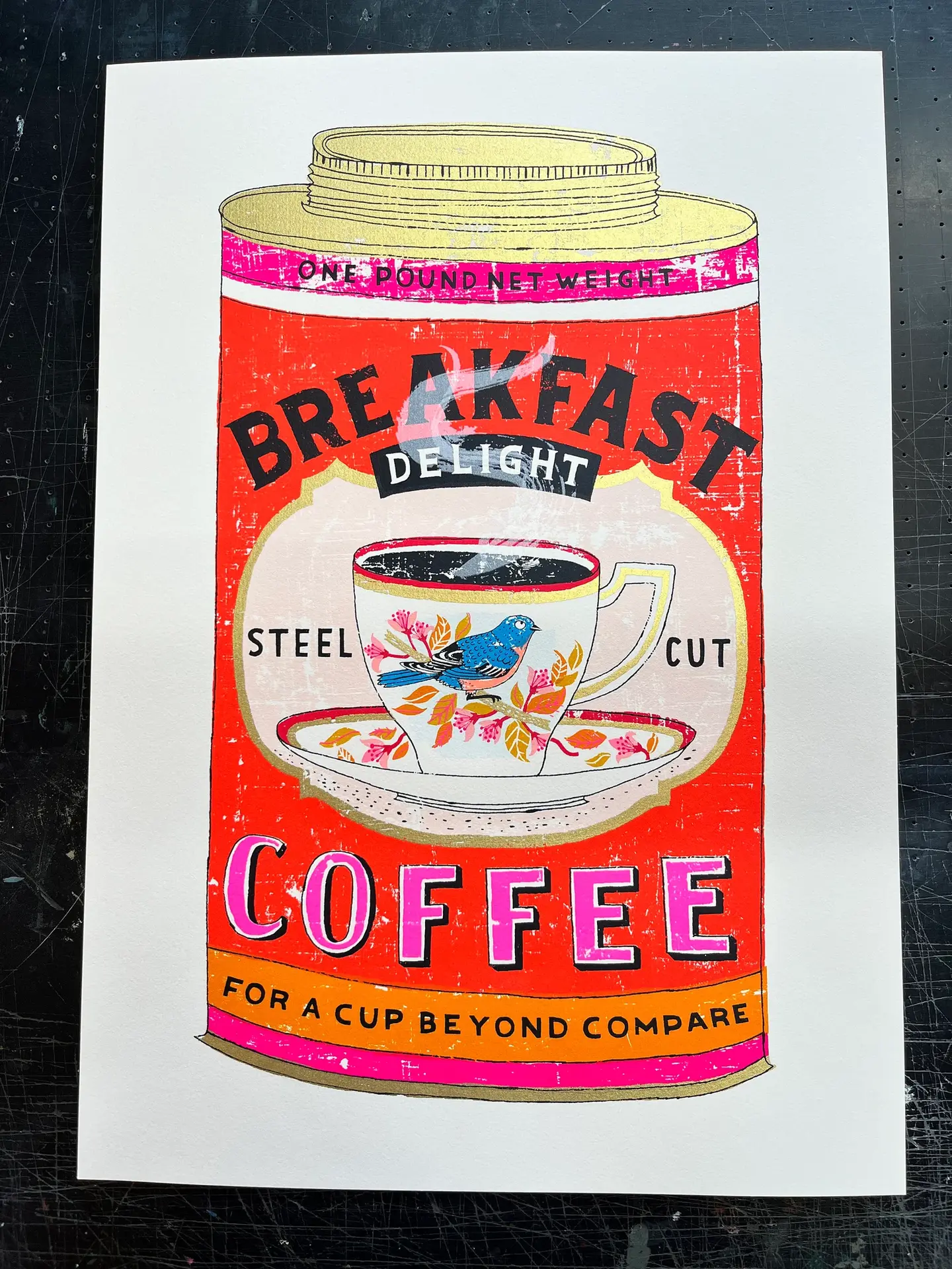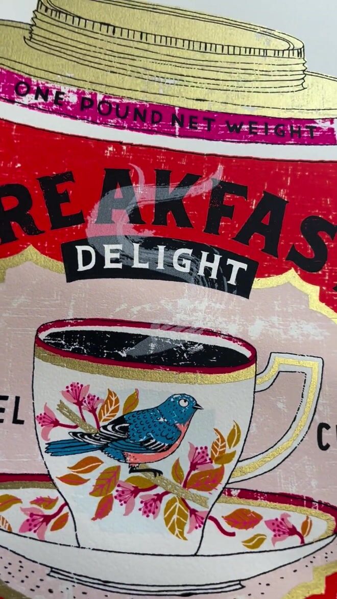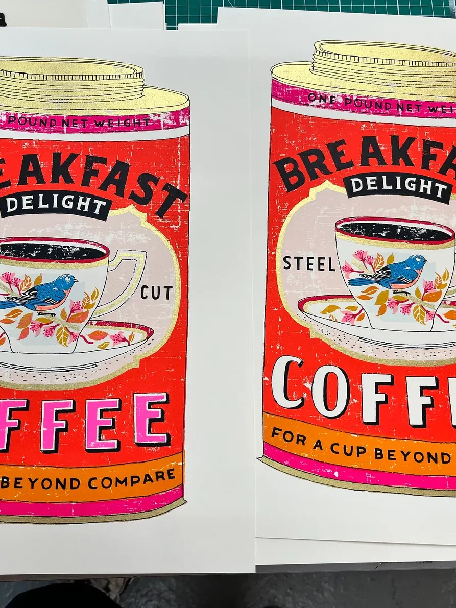 A handmade screen print of a slightly made up vintage coffee tin - it features a steaming cup of delicious black coffee. The cup is decorated with a chirpy looking bluebird, perched on a gold branch, nestled among some very chic foliage...lucky thing.