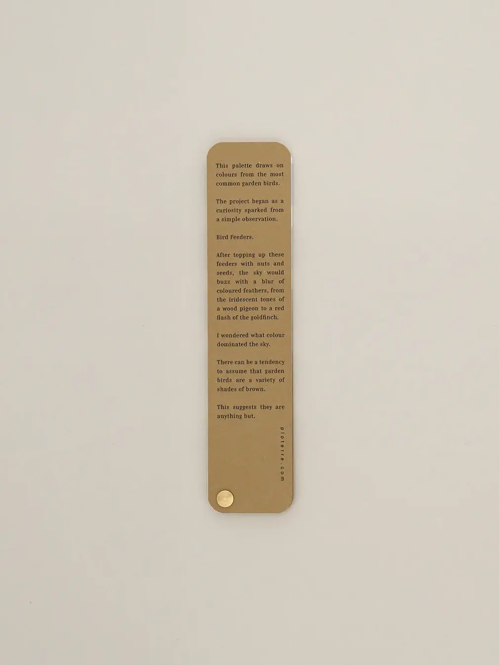 100 colours from the 20 most common garden birds in the UK have been ranked based on how prevalent the bird and how dominant the colour and presented in a book based on the infamous pantone swatch. As well as providing an easy comparison across colours, this book also expands on the process behind the work.