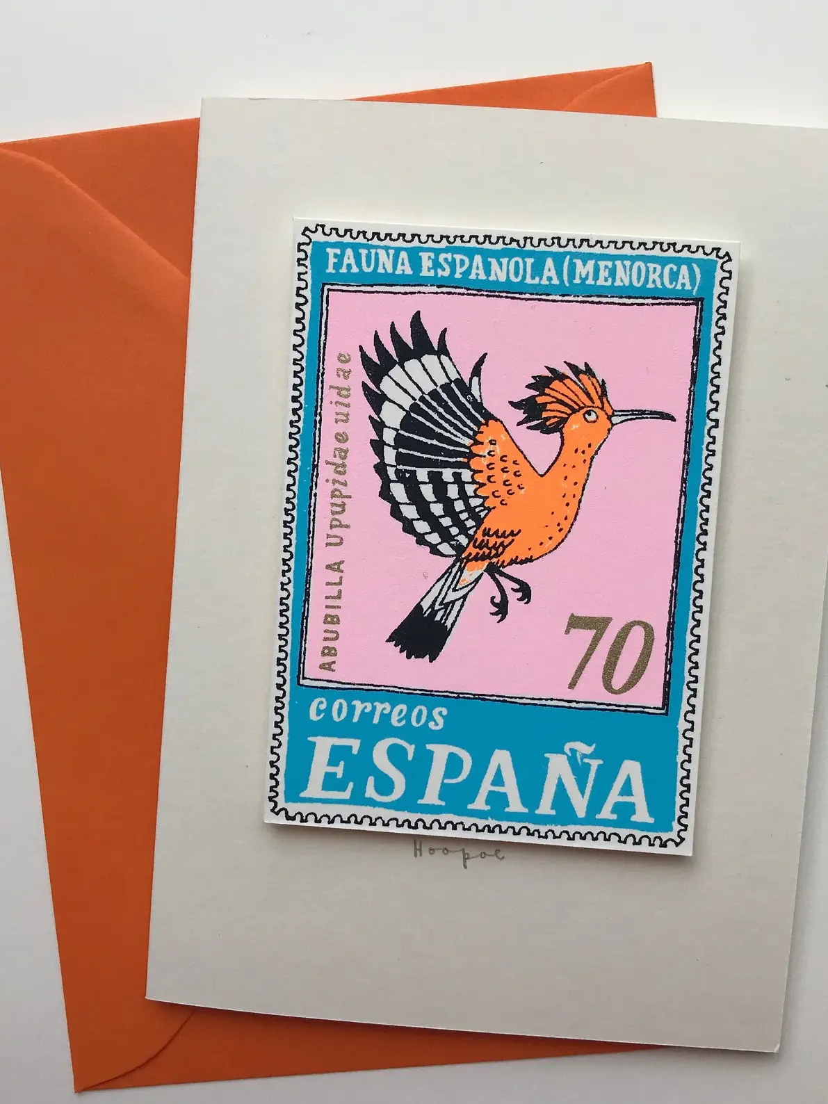 A brightly coloured hoopoe bird flapping away on a (made up) Spanish stamp - celebrating the fauna of the Spanish islands!