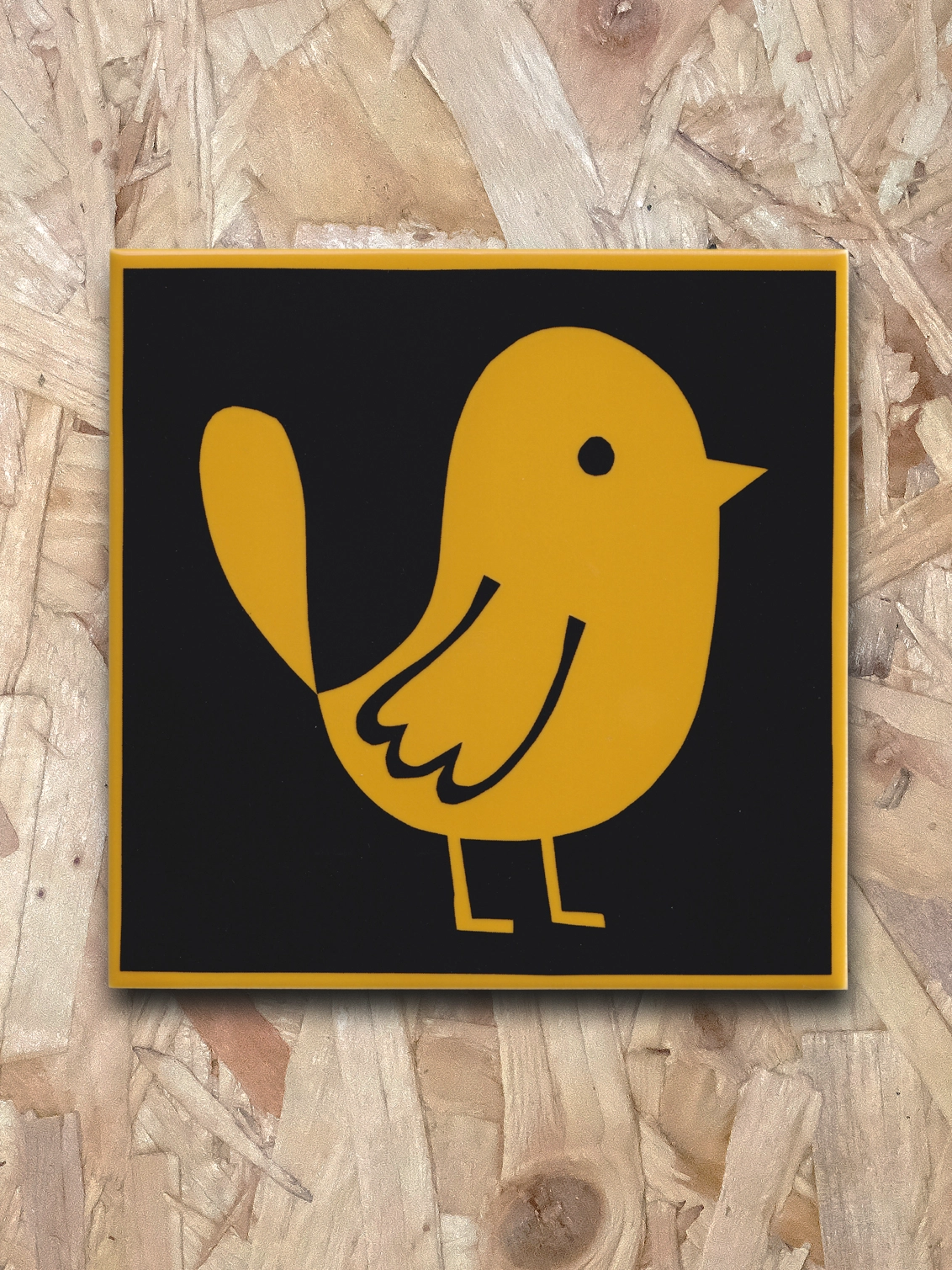 This tile has an illustrated bird on a glossy yellow background.