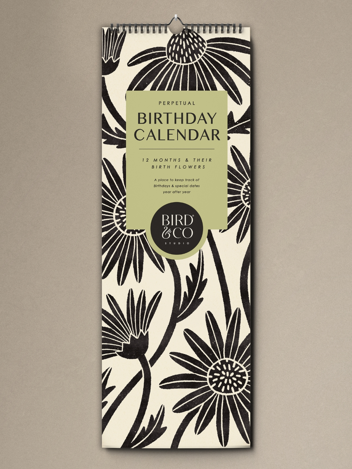 Perpetual birthday calendar featuring 12 Lino-print illustrations of each month's unique birth flower and their meanings. These calendars are designed to be used year after year as a place to keep track of birthdays, anniversaries and special dates.