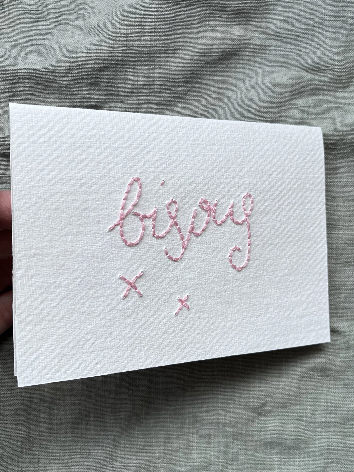 Hand embroidered card, back stitched with cotton on thick, textured khadi paper.