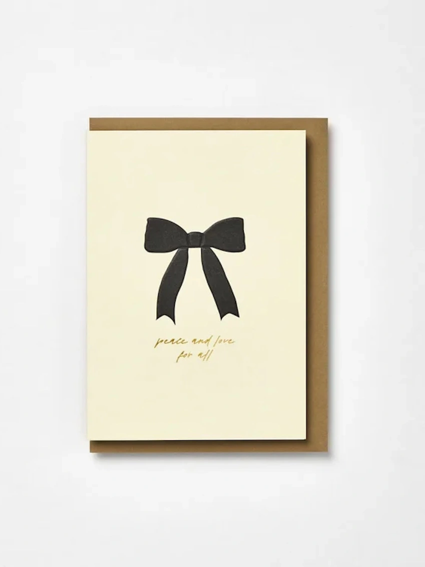 A beautiful sentiment, pertinent in 2025. This card is delicately embossed with a black, festive bow and 'Peace and love for all' gold foiled on the front - just what we're all wishing for this festive season.