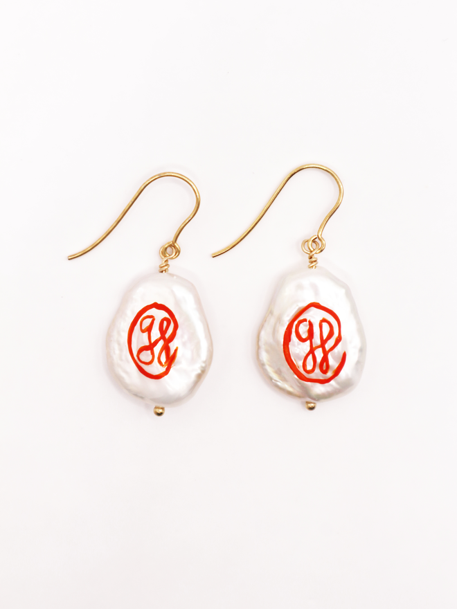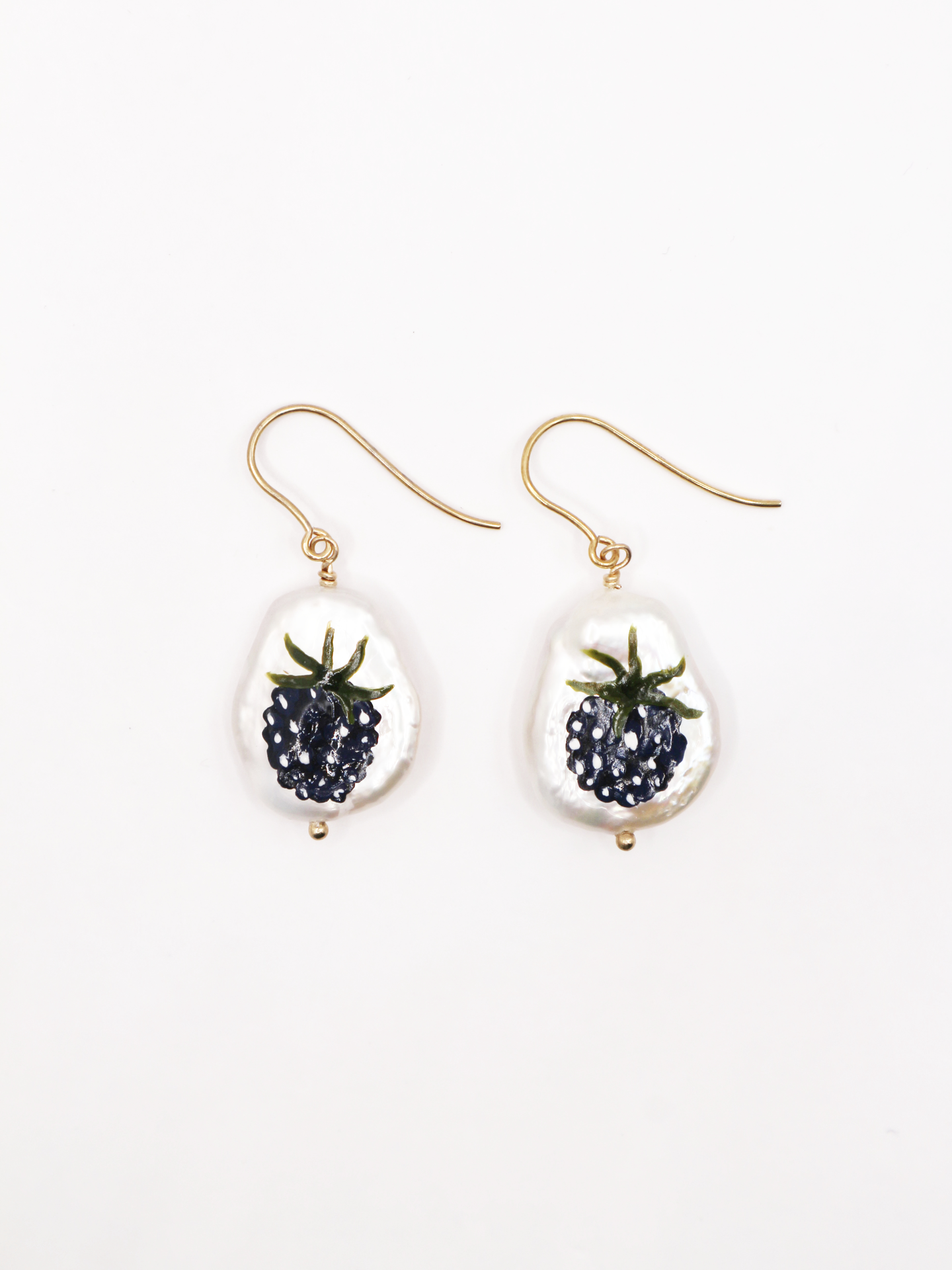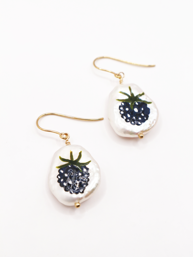A pair of petal shaped pearls set in recycled 9ct gold and finished with a hand painted blackberry motif.