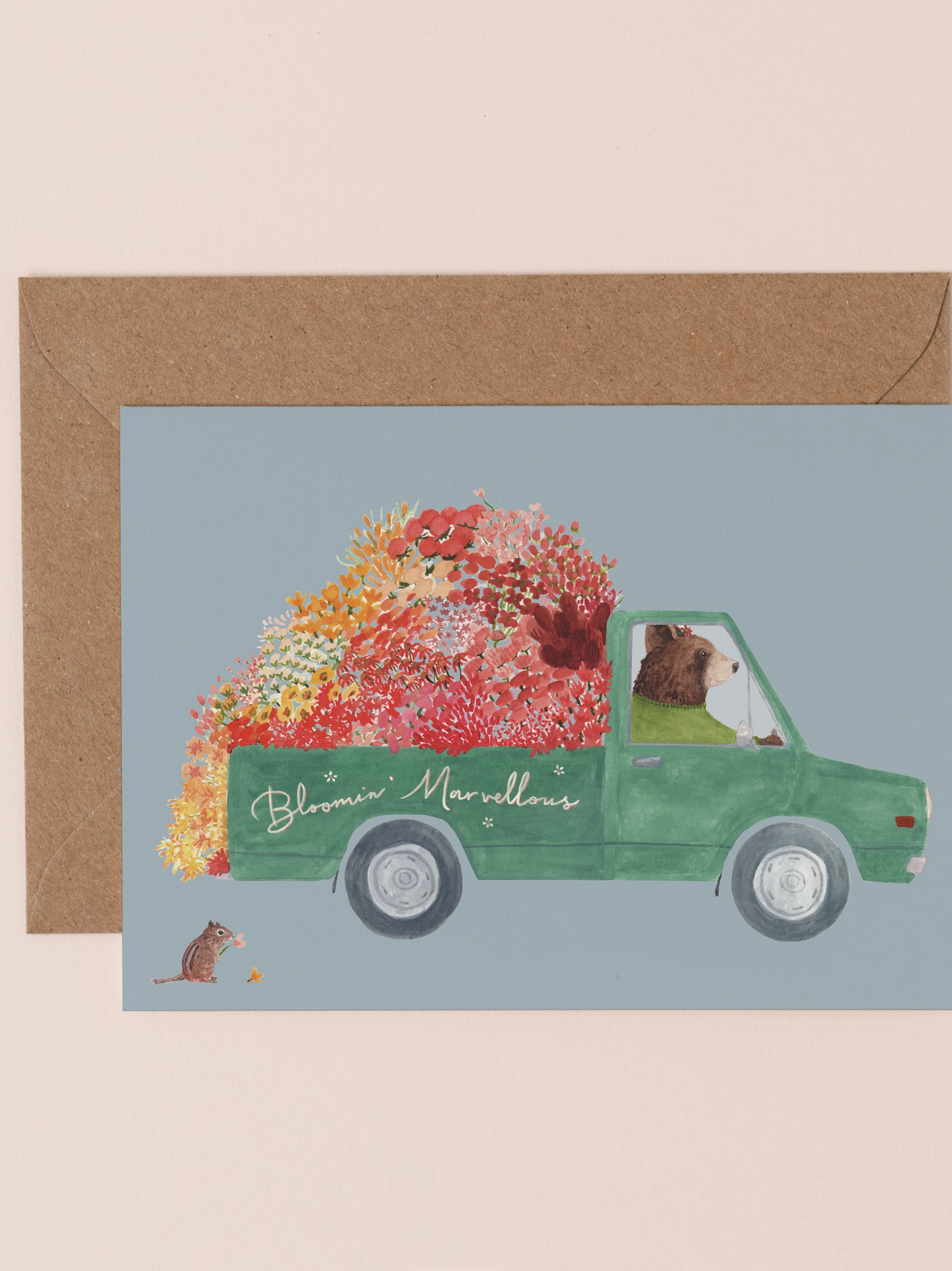 Printed from an original watercolour illustration of a bear driving a van full of colourful flowers. Printed in the UK on 300gsm matt white card.