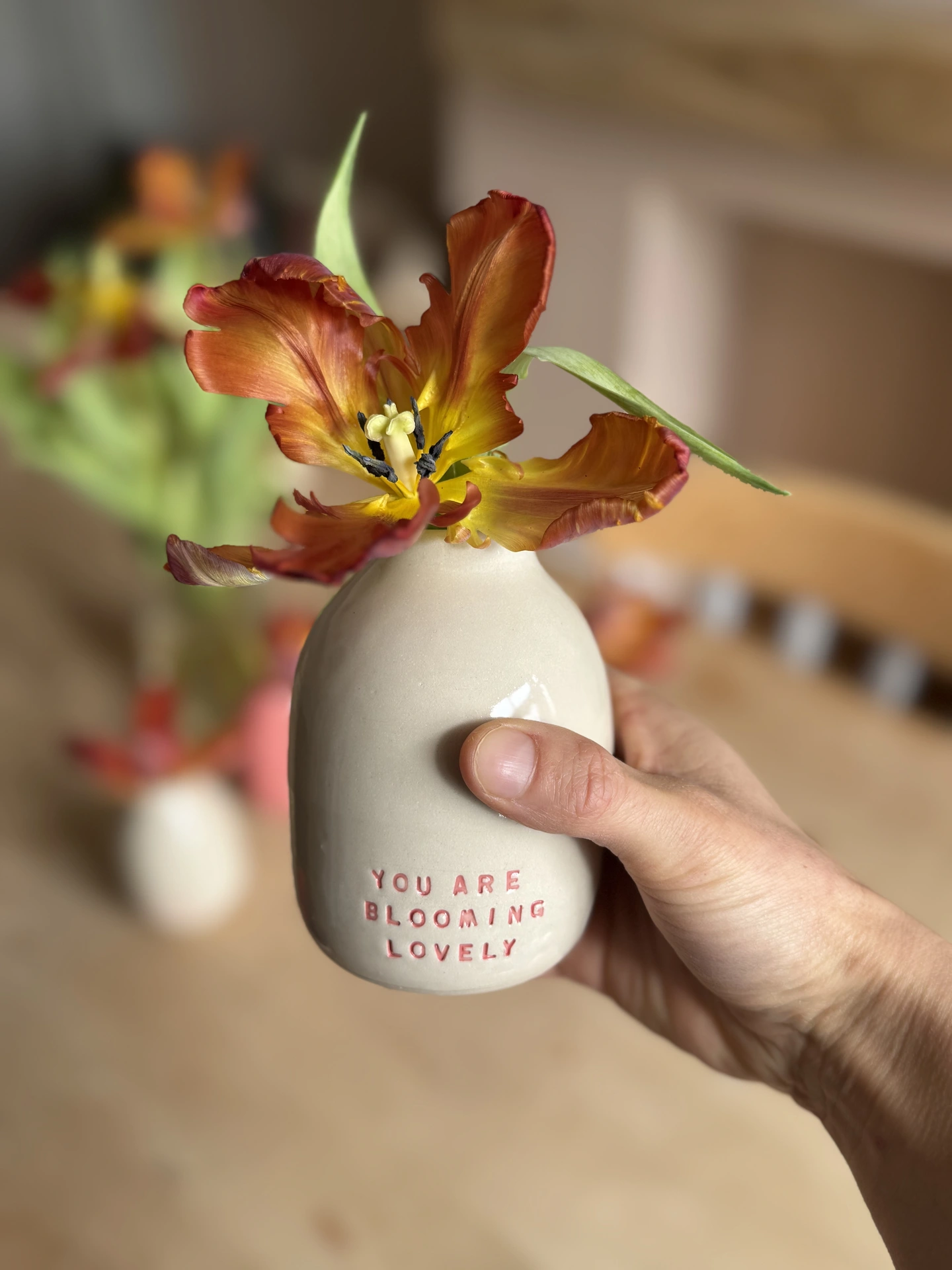 This listing is for a single handmade ceramic bud vase with 'You are blooming lovely' engraved on the front. Perfect for holding small flower arrangements or dried flowers and sure to brighten someone's day...
