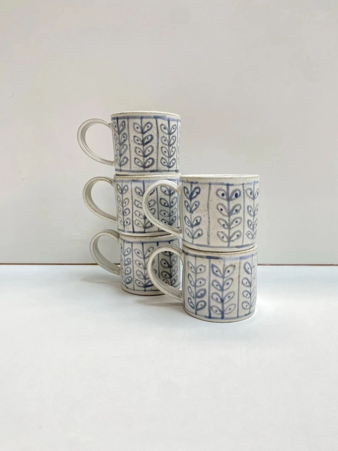 Hand painted at green ware stage with underglazes. Bisque fired and then high fired with a lovely tin shiny glaze over the buff clay to allow the illustrated flowers to show through. I’ve used stoneware buff clay which is high fired to 1260 degrees in the kiln, which makes these mugs fit for purpose and functional.