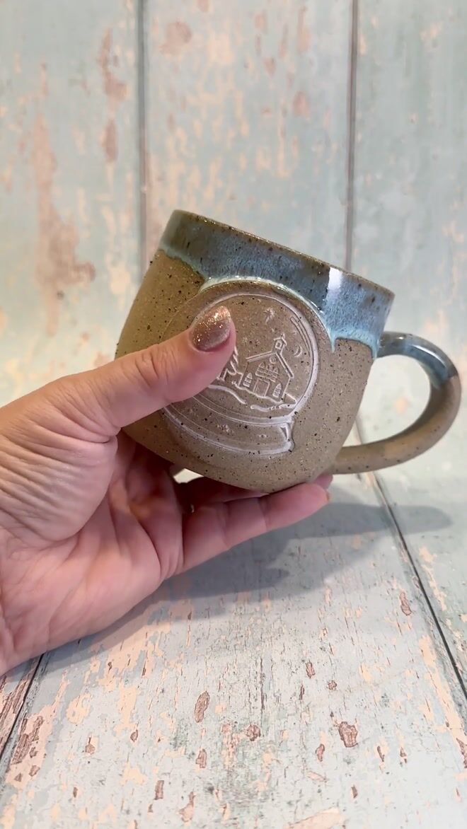 This one of a kind Christmas Snow Globe mug is made from lava fleck stoneware with white snow globe and a blue glaze, with a decorated bottom.