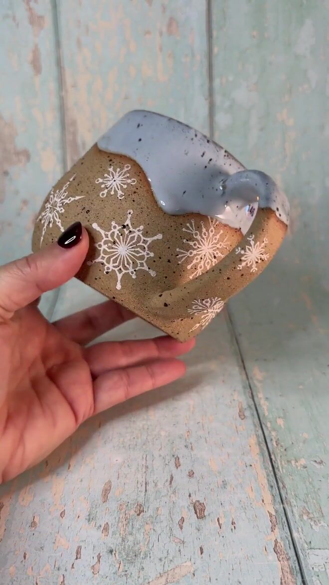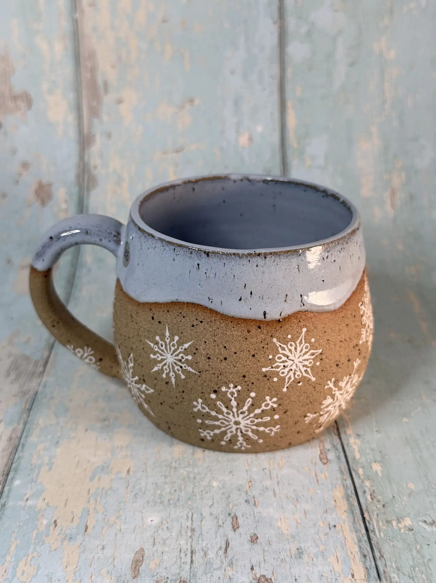 This one of a kind Christmas Snowflake mug is made from lava fleck stoneware with white snowflakes and a blue glaze, with a decorated bottom...