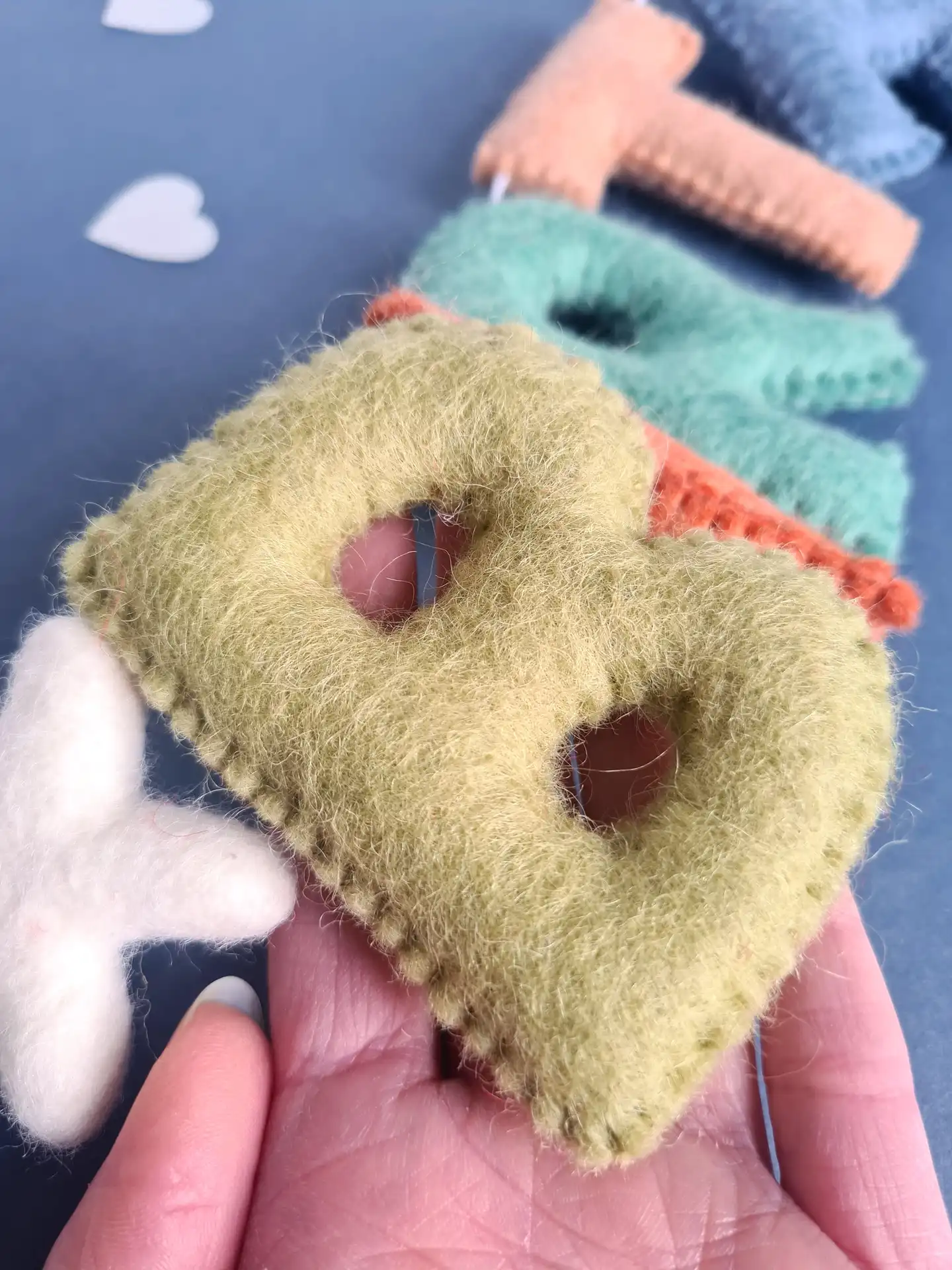 Each letter in muted tones is handmade in Nepal using New Zealand felt wool and measures approx 8cm in height. They are then hand strung in my studio onto a continuous length of strong white waxed cotton cord and finished with a loop at either end for ease of hanging.