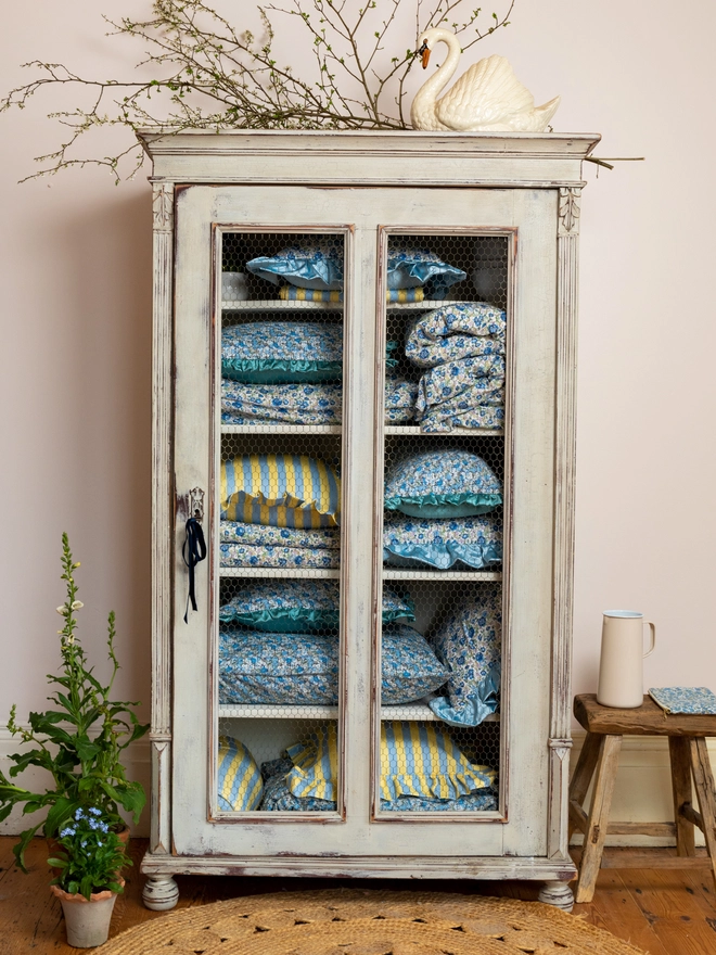 This fabulous bolster cushion is handmade from our striped linen ‘Trianon.’ Designed by Poppy and Honesty this luxurious velvet features stripes in regal navy and sky blue. We think it co-ordinates rather beautifully with other pieces from our collection including our Liberty fabric silk ruffle cushion ‘Bow Bouquet’.