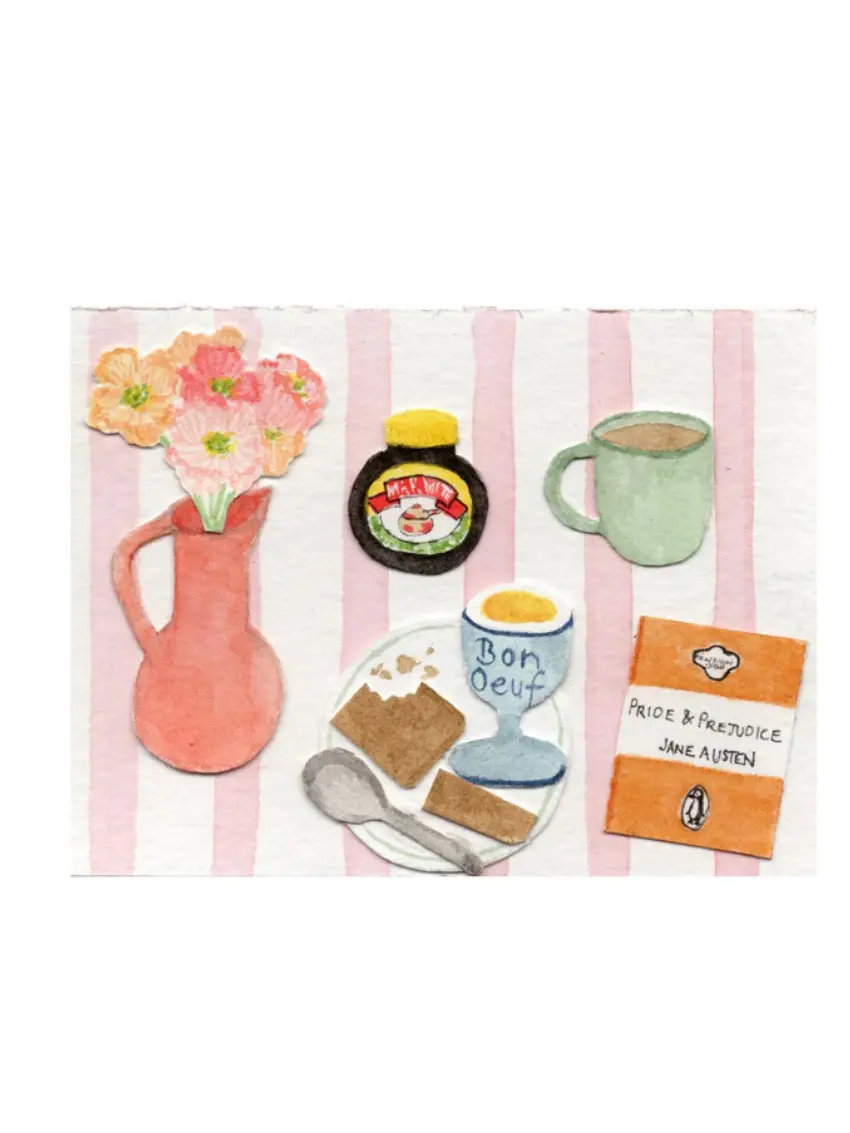 Printed card of an original hand illustrated collage of a breakfast scene.
