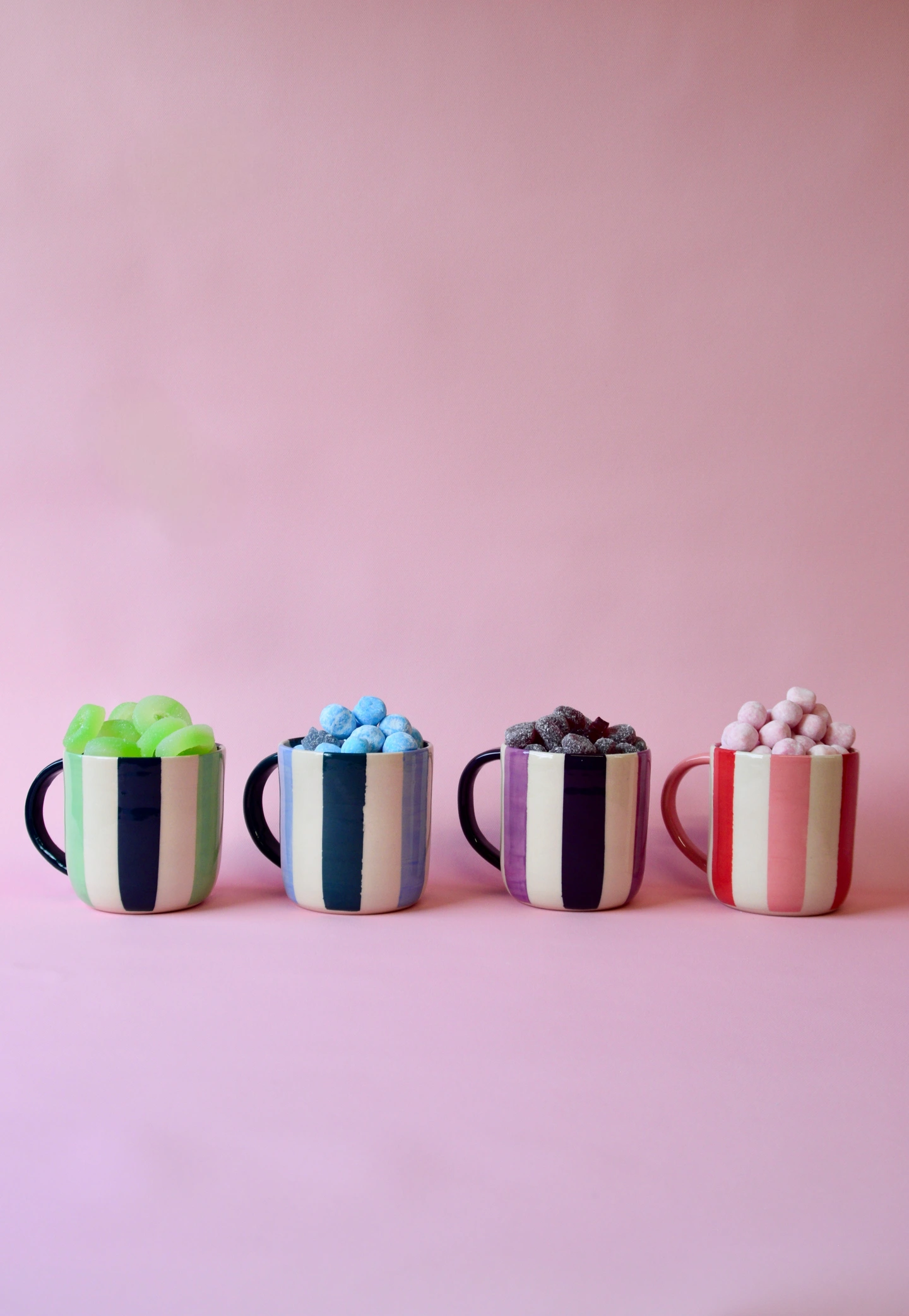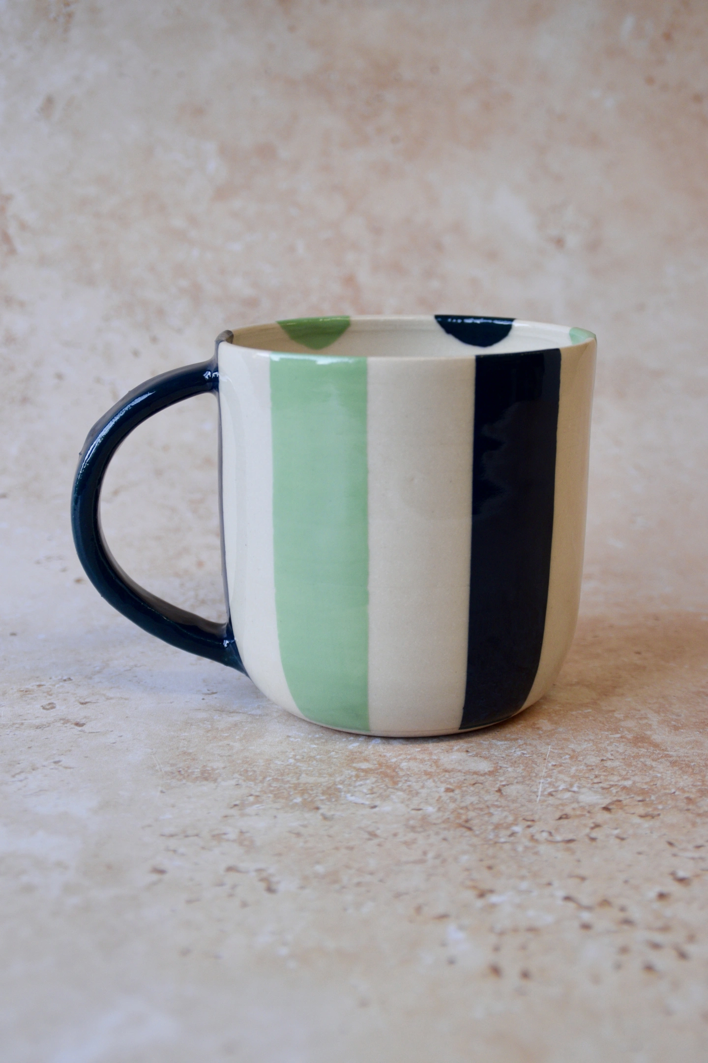 Handmade in small batches, each mug is hand-painted with bold vertical stripes and finished in a glossy glaze for that perfect pop.