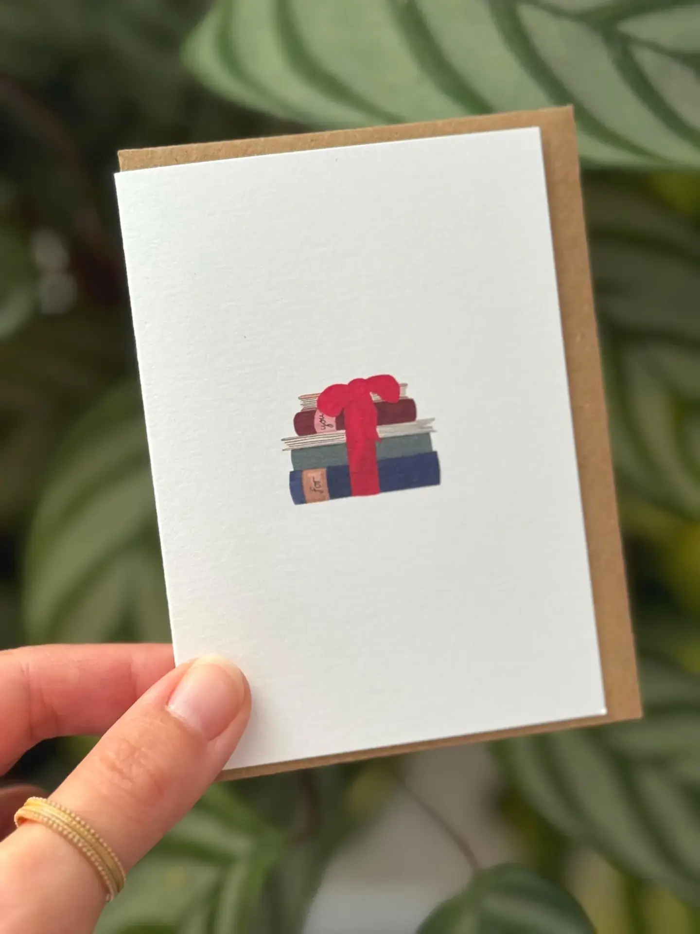 A stack of books wrapped in red ribbon, one book has the title "For" and another one "You". This watercolour mini card is perfect for the lover of books and reading. Perhaps it can be given along with book money or tokens or why not attached to the book you are gifting? The card is hand painted by me and professionally printed on delicately textured matte white 324 gsm luxury print paper.