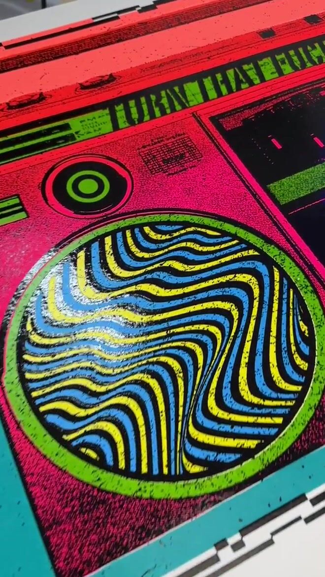 XL boombox screenprint. Six layers of hand-pulled ink with fluorescent colours on recycled paper.