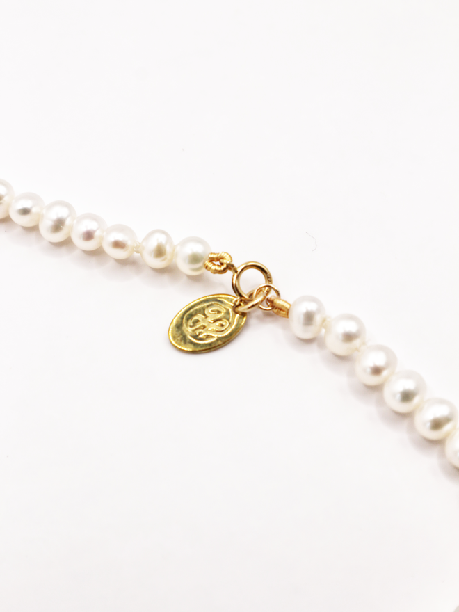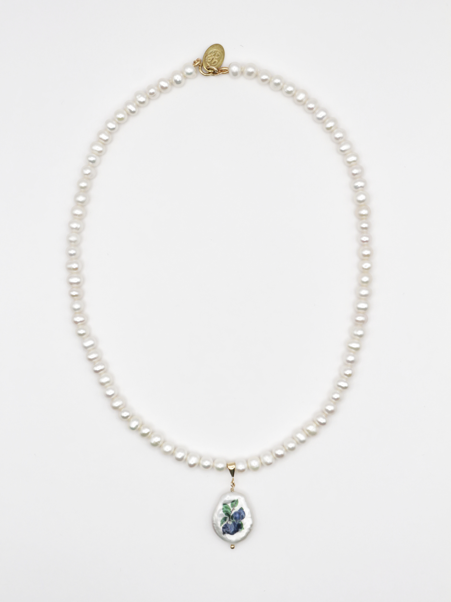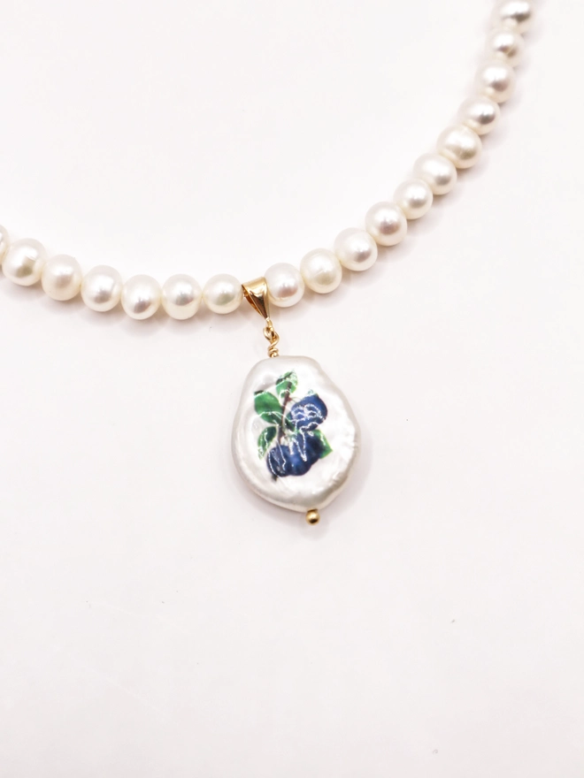 A fresh water pearl necklace with a petal shaped pearl pendant hand printed with a botanical plum motif.