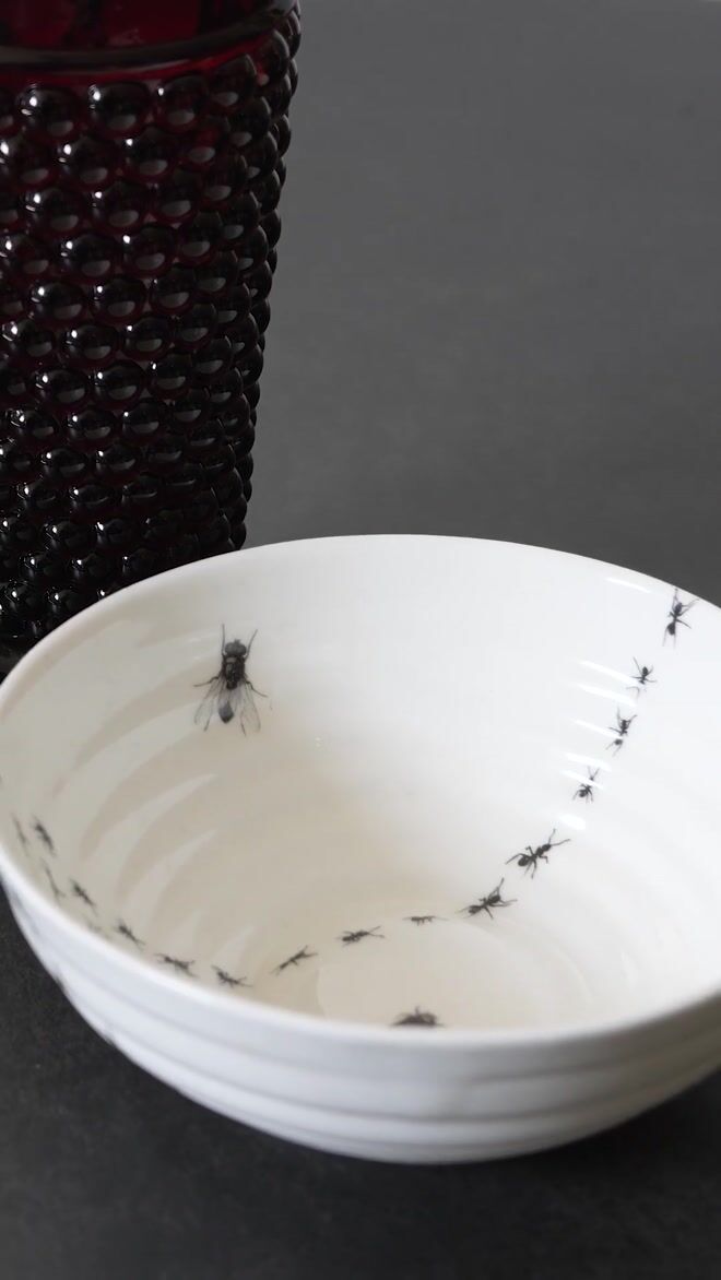 This ribbed porcelain bowl features a merry procession of insects travelling across it's surface. Hand made in fine bone china, it is decorated using ceramic transfers.