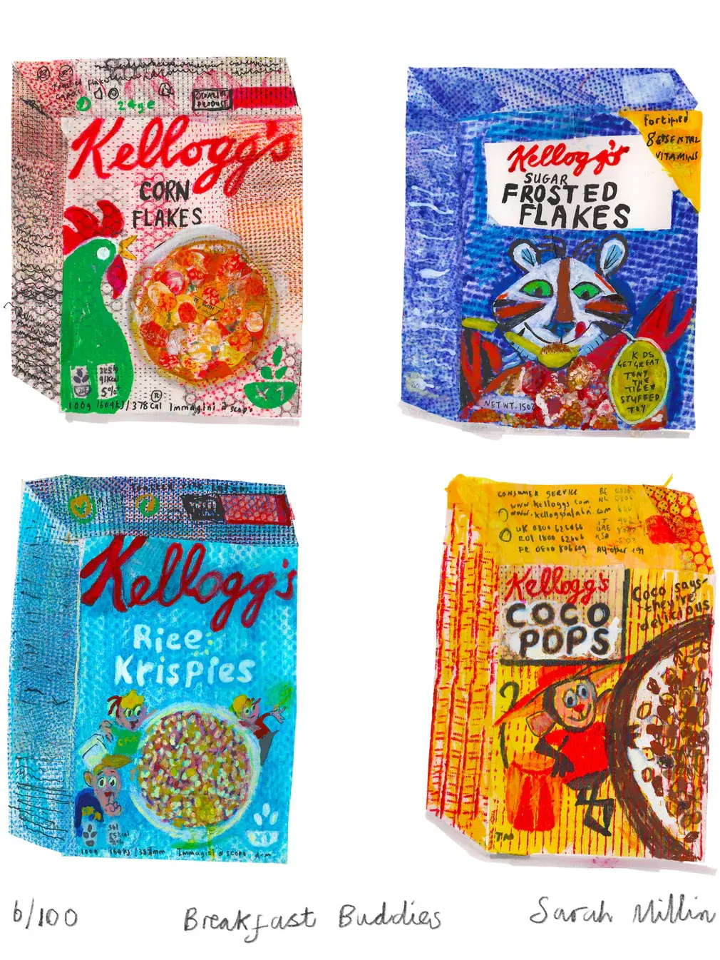 Breakfast Buddies features Kellogg's Corn Flakes, Kellogg’s Frosted Flakes, Kellogg’s Rice Crispies and Kellogg’s Coco Pops. A custom product produced from hand created mixed-media artwork.