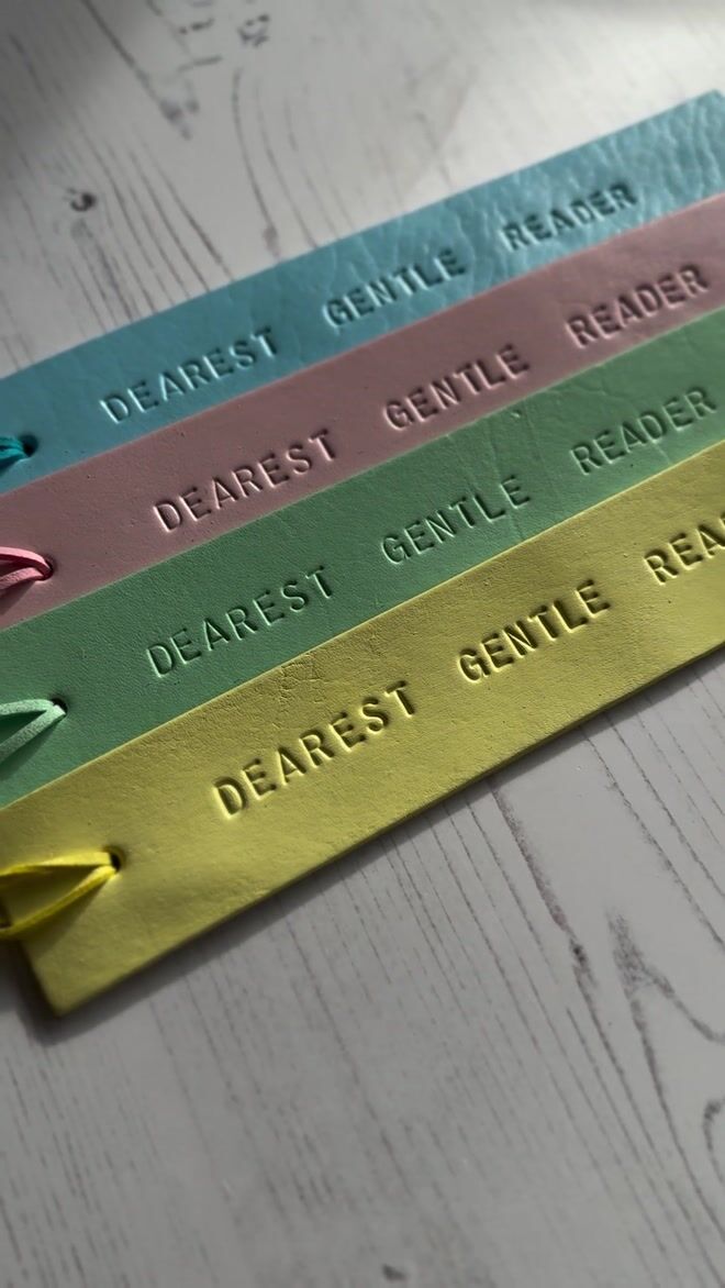 Add a touch of Regency elegance to your reading with this hand-stamped, 'Dearest Gentle Reader' painted leather bookmark inspired by the soft pastel hues of Bridgerton. Handmade in my Surrey studio from the finest quality leather, each bookmark is individually cut, painted, and stamped to order, making it a unique accessory or thoughtful gift for book lovers.