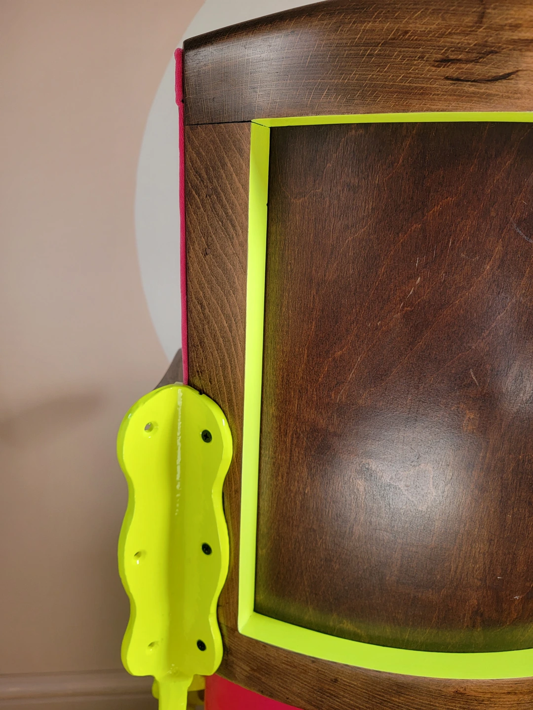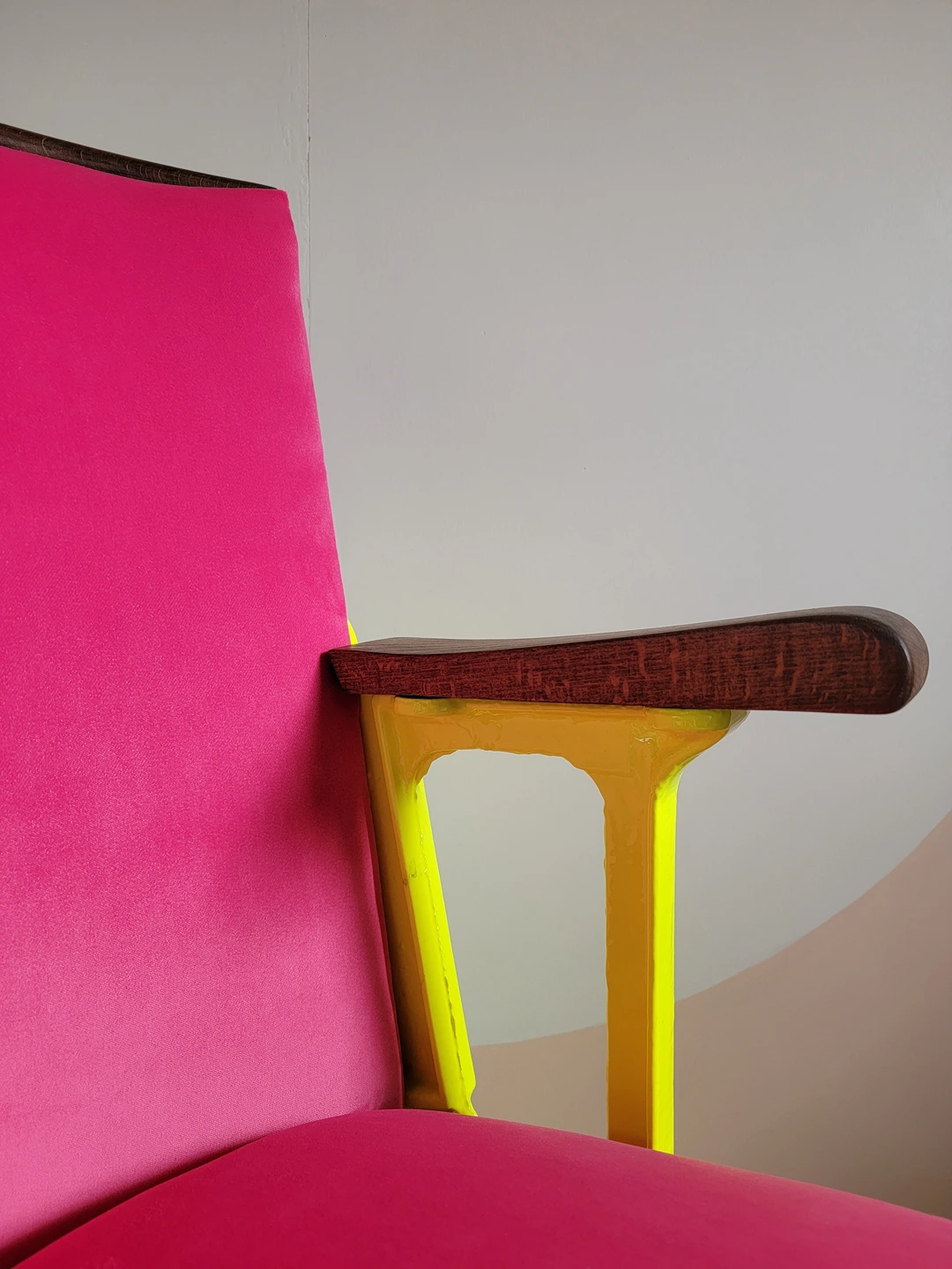 This single cinema seat teams a hot pink velvet fabric with flourescent yellow cast iron fixings. Finished with a unique hand painted stripe design to the seat base and matching painted highlights to the inside edges of the seat back.