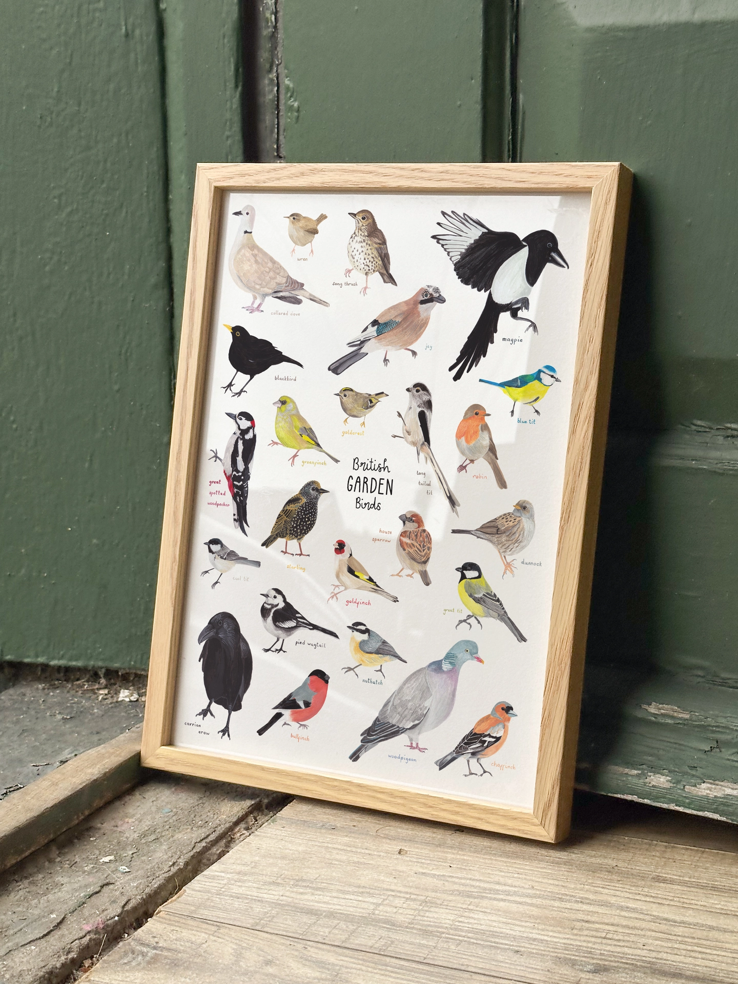 A watercolour painting featuring many of Britain's favourite garden birds. Perfect tool to teach kiddies about what they see in your garden or as a lovely birdy print bringing the outdoors in!