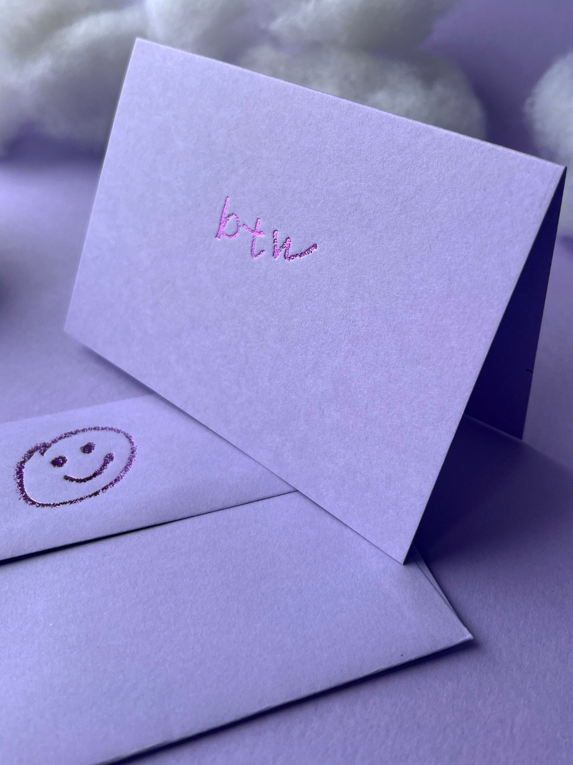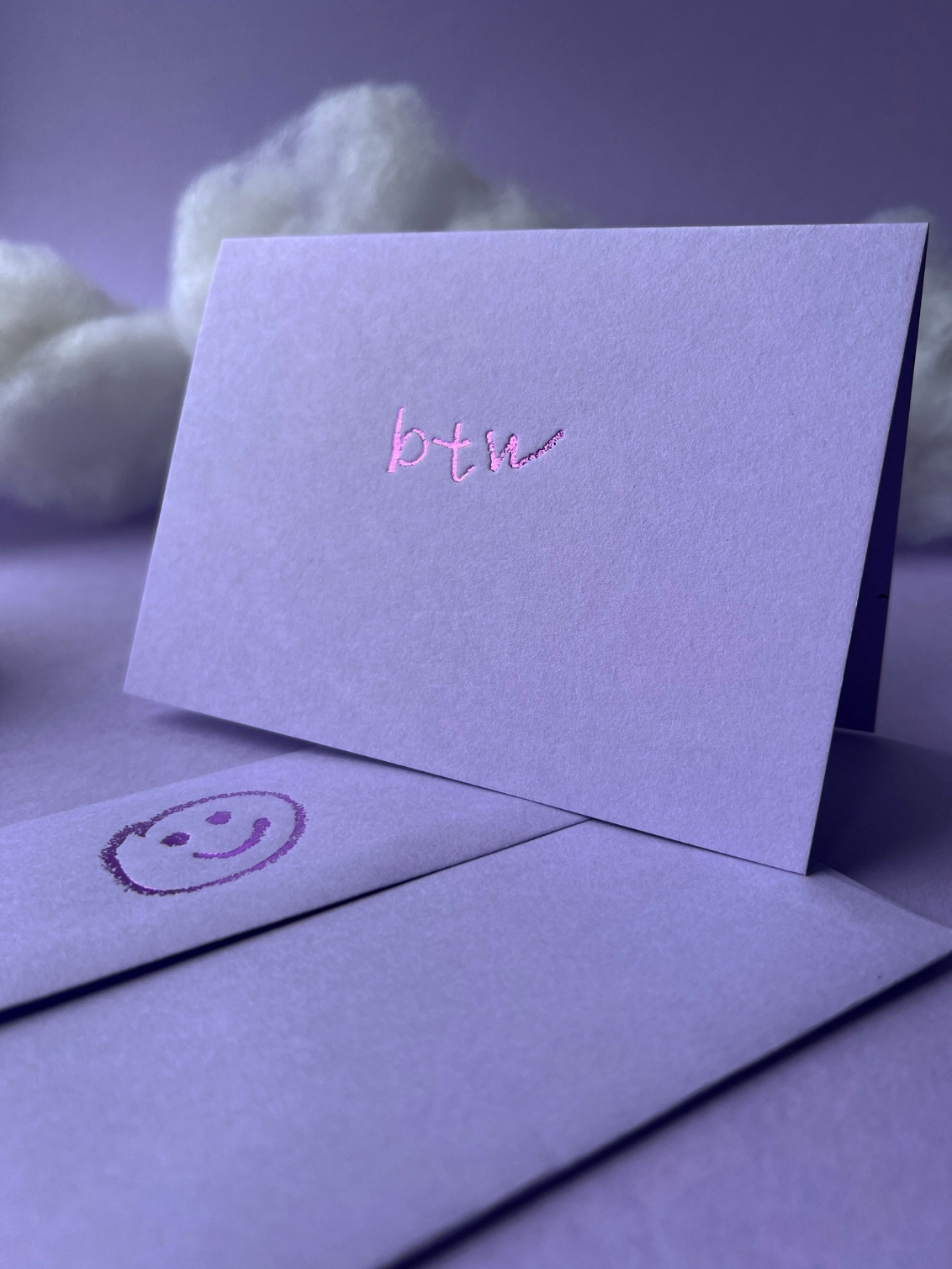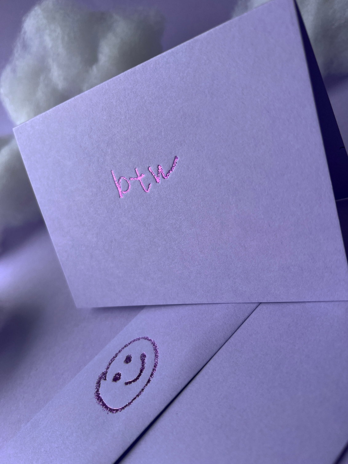For side notes, secret reveals, or when you’ve got something to add. btw is the casual opener that works for birthdays, gossip, or big announcements. Hand foiled on lavender coloured paper with shiny metallic detail and a smiley design on the envelope.