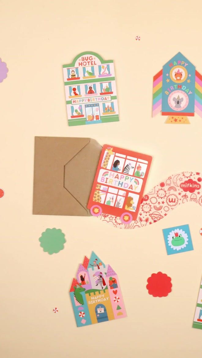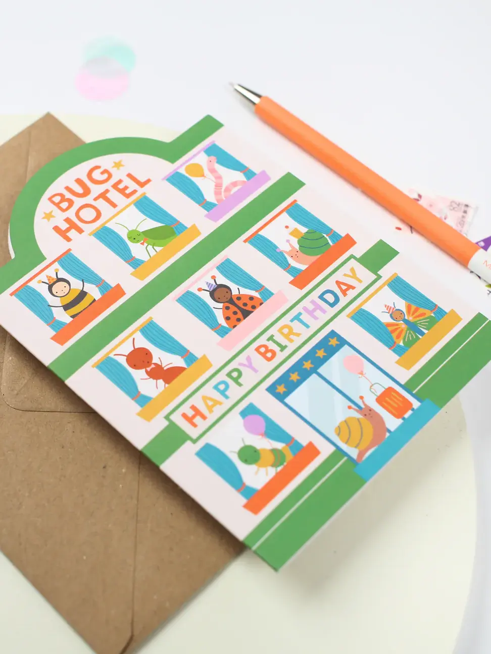 Illustrated with bright colours, the caption reads 'Happy Birthday' and is die cut into the shape of a hotel for an extra special bit of magic. This luxury card was designed and made in the UK and is the perfect card for the bug loving girl or boy.