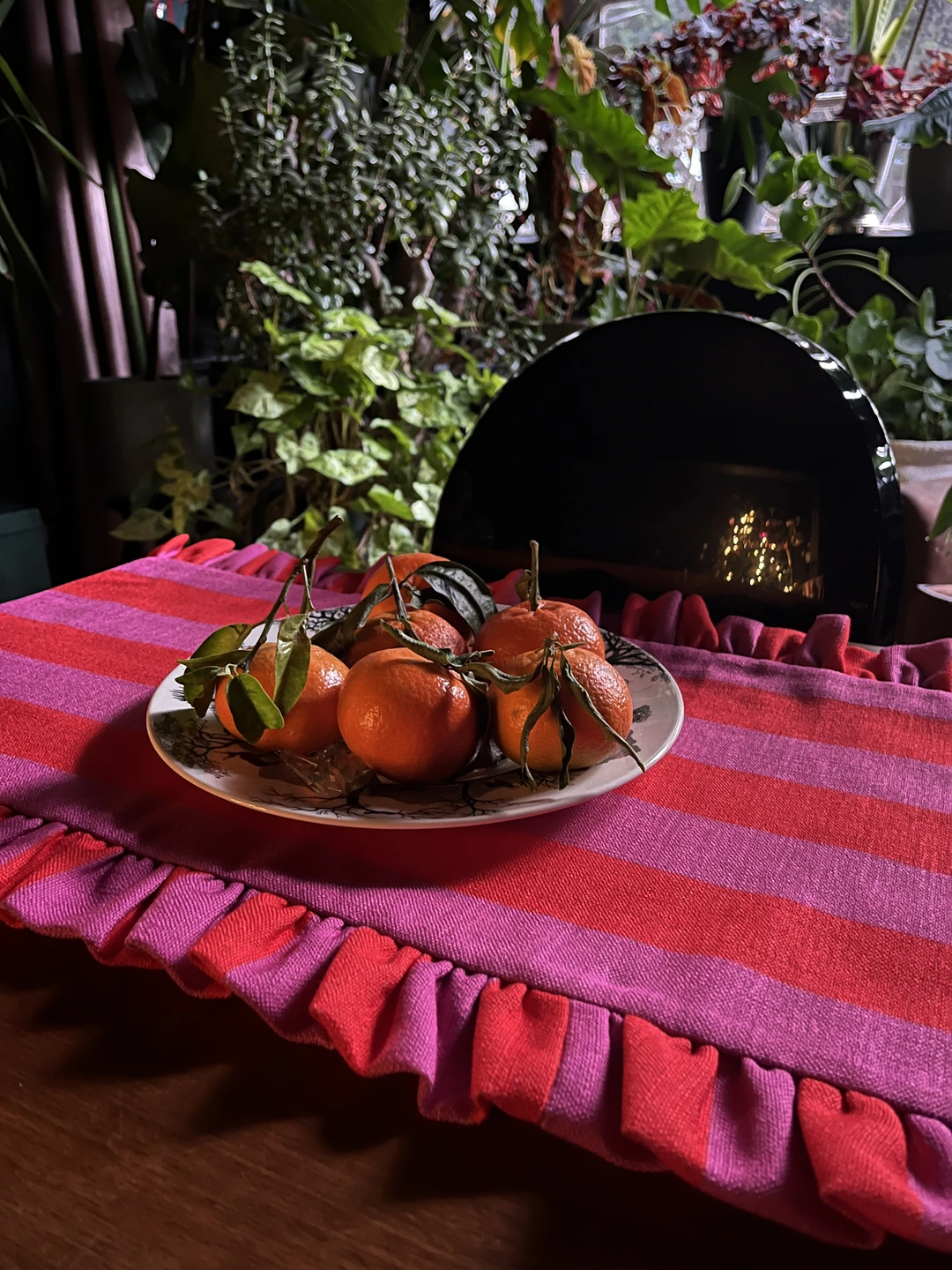 Elevate your table setting with our luxurious burgundy and coral stripe ruffle table runner. Made from a richly textured fabric, this piece boasts deep, vibrant colours that bring warmth and sophistication to any occasion. The playful ruffle along the edges adds a charming touch of elegance, perfect for both casual dinners and special gatherings.