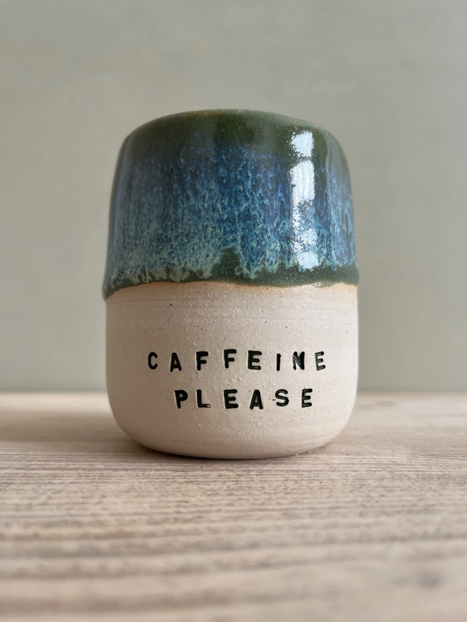 Dripping green-blue on stoneware with green engraved writing ‘Caffeine Please'.
