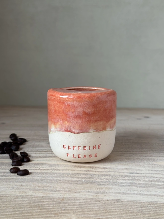 Melting pink glaze on stoneware with pink engraved writing ‘Caffeine Please'.