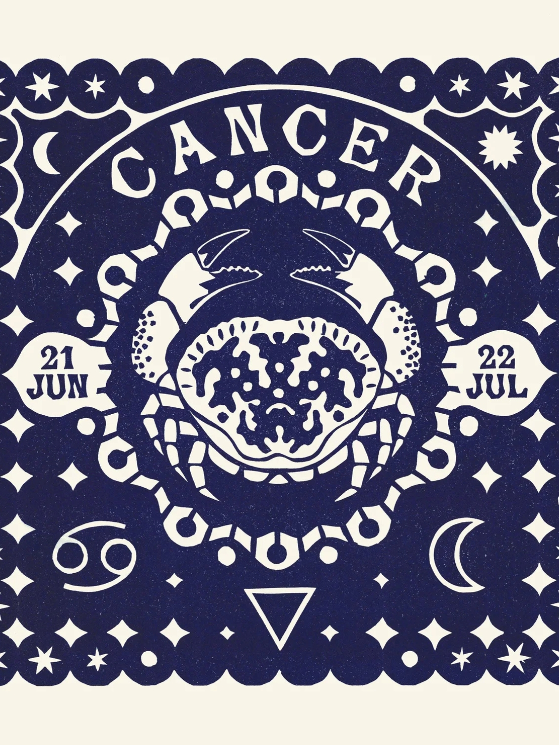 Shown on this print is an approximate date span for Cancer of June 21 – July 22. The dates may vary slightly each year due to Earth's orbit and leap years, so those born near the start or end should check their birth chart to confirm their sign.