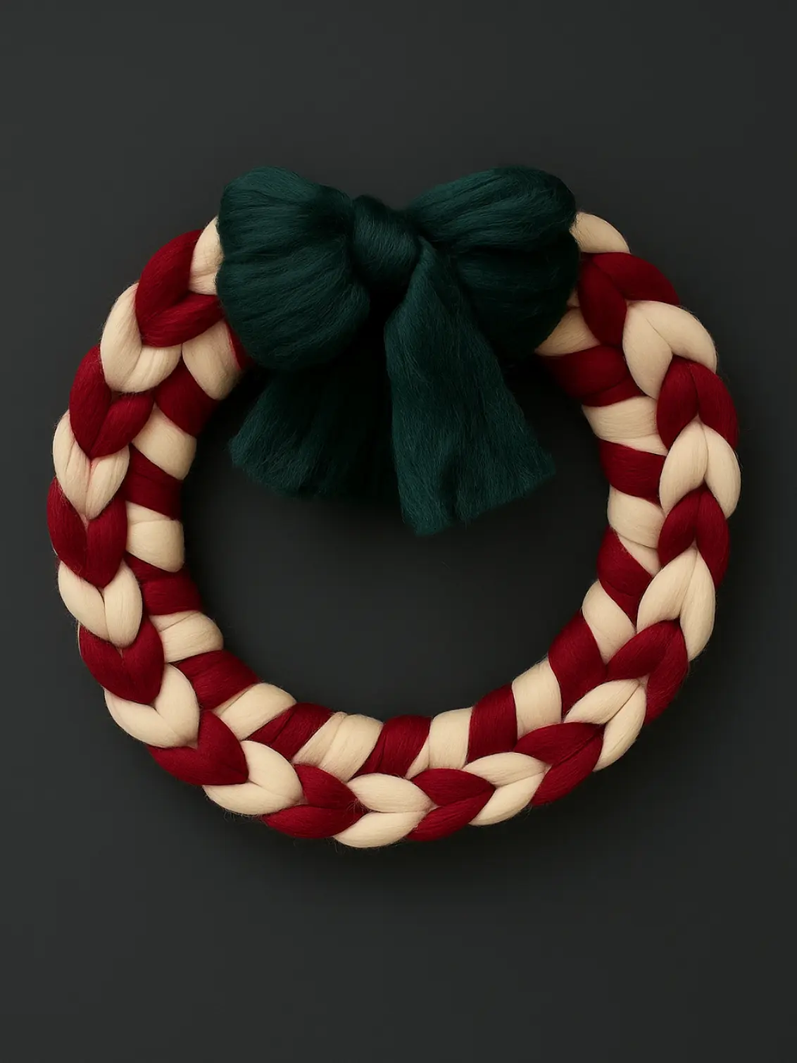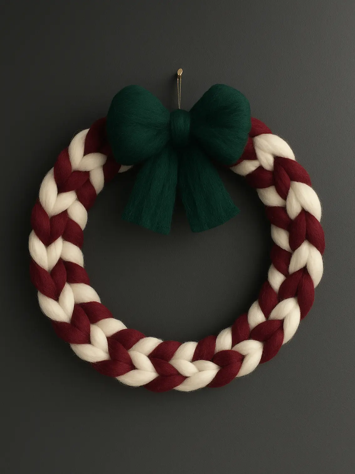 Chunky Knitted Merino candy cane wool round wreath with conifer green Bow