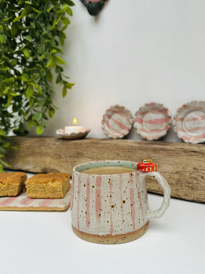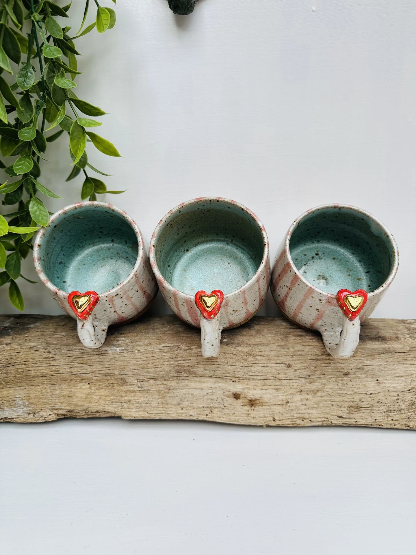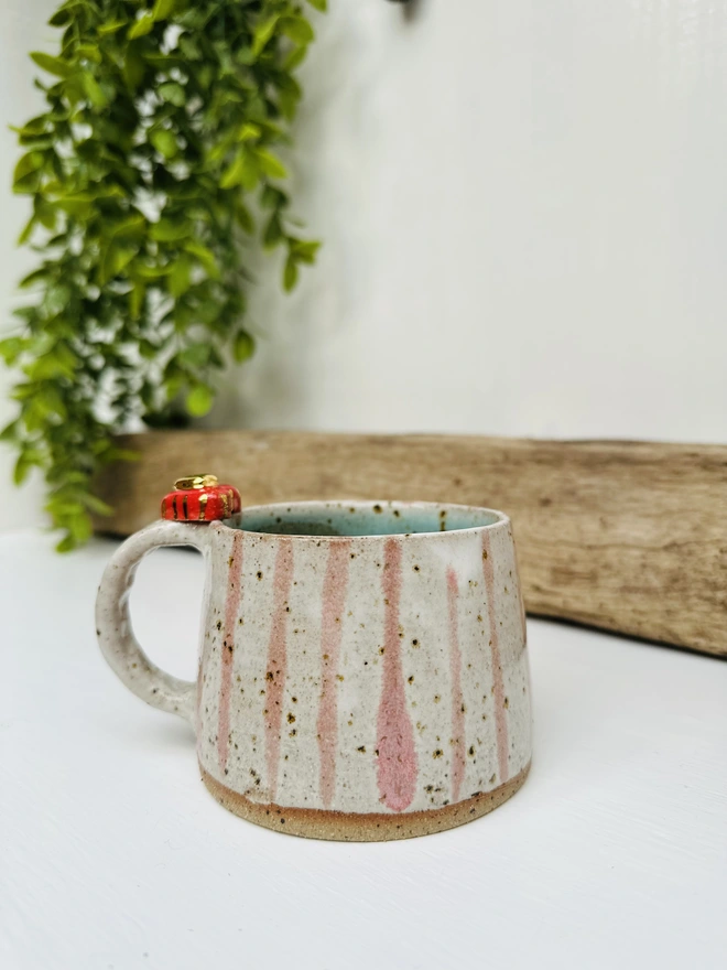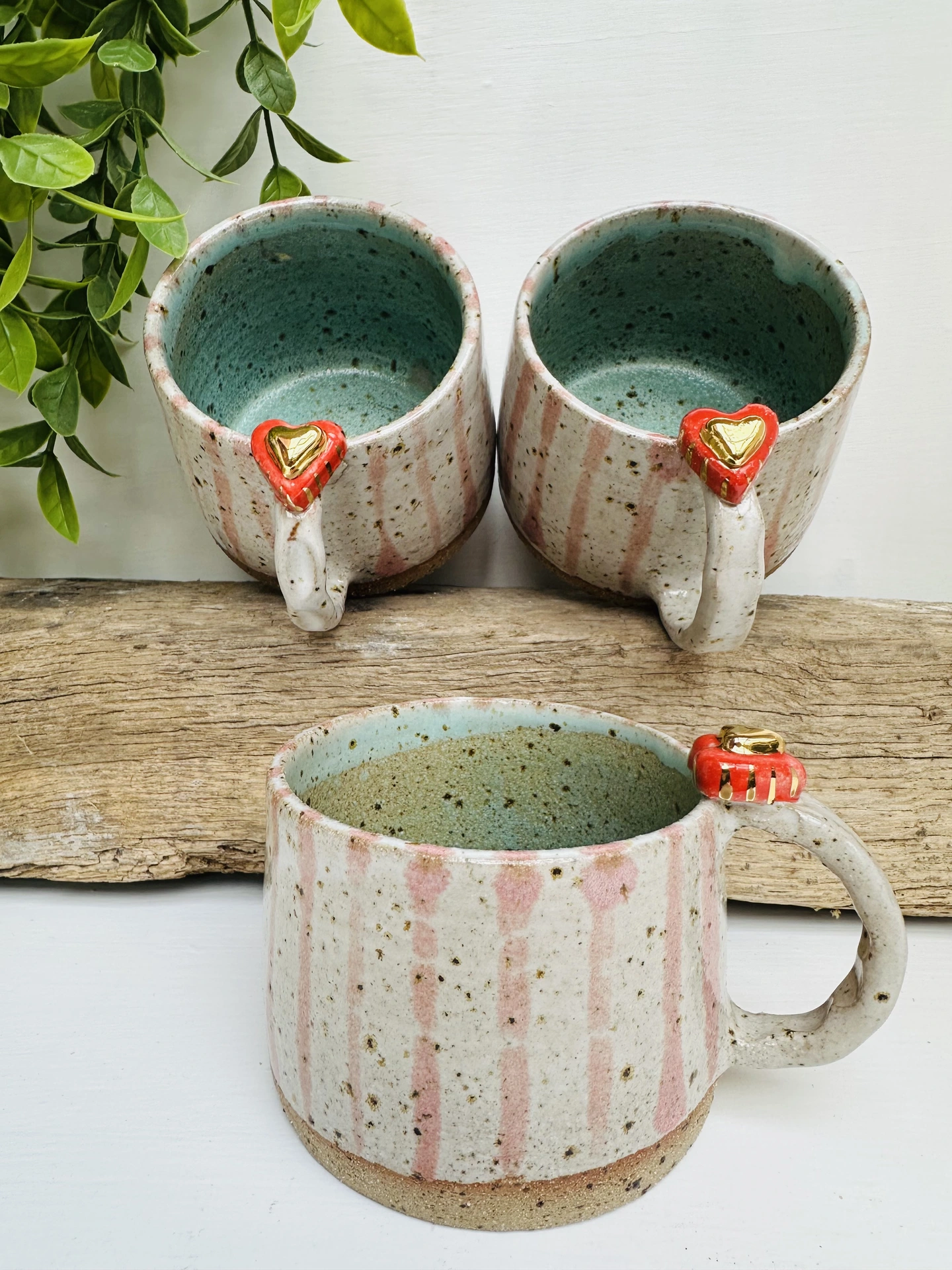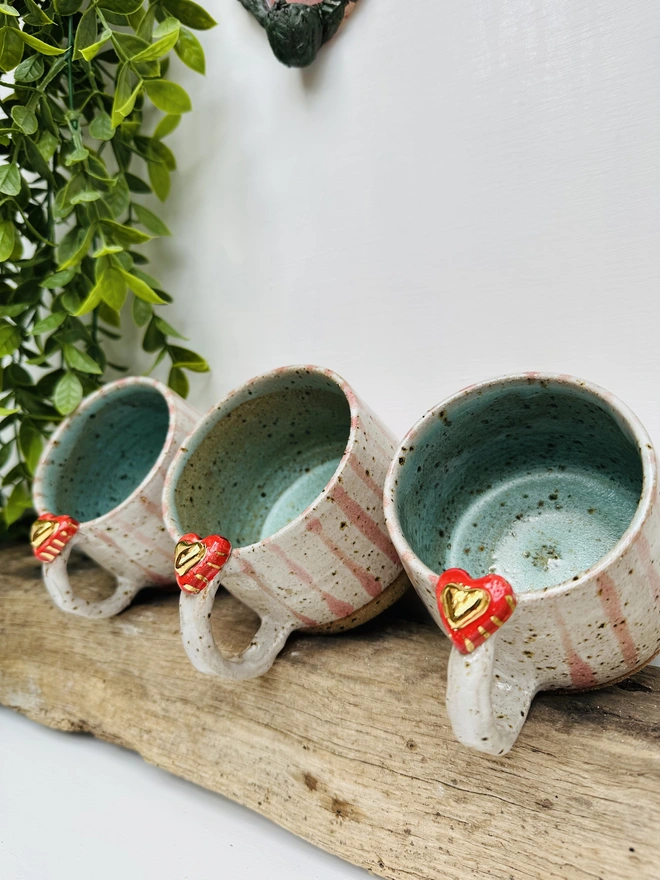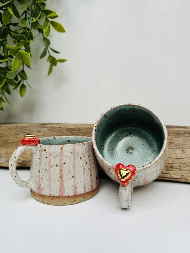 Each mugs lovingly wheel-thrown from speckled clay, giving every piece its own natural character. The handles are carefully shaped and finished with two delicate hearts one in red and mini gold heart, making each one truly unique. A gentle cream glaze brings out the warmth of the clay with speckles showing through, with soft pink stripes brushed by hand for a touch of charm.
