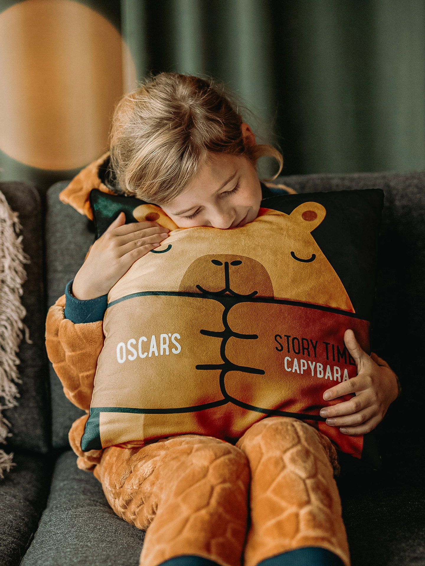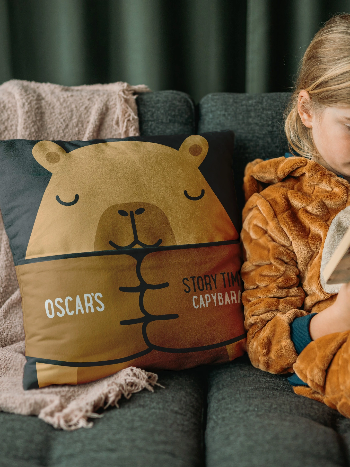 A beautifully soft, personalised Capybara Story Pocket Cushion, featuring a friendly bear who holds your child’s favourite book in the pocket. Handmade in the UK, it brings calm, comfort and imagination for every bedtime or story time