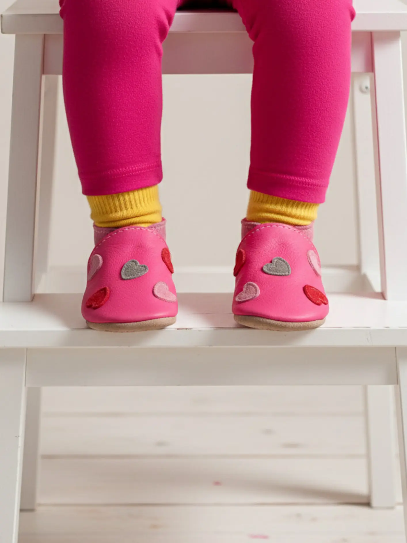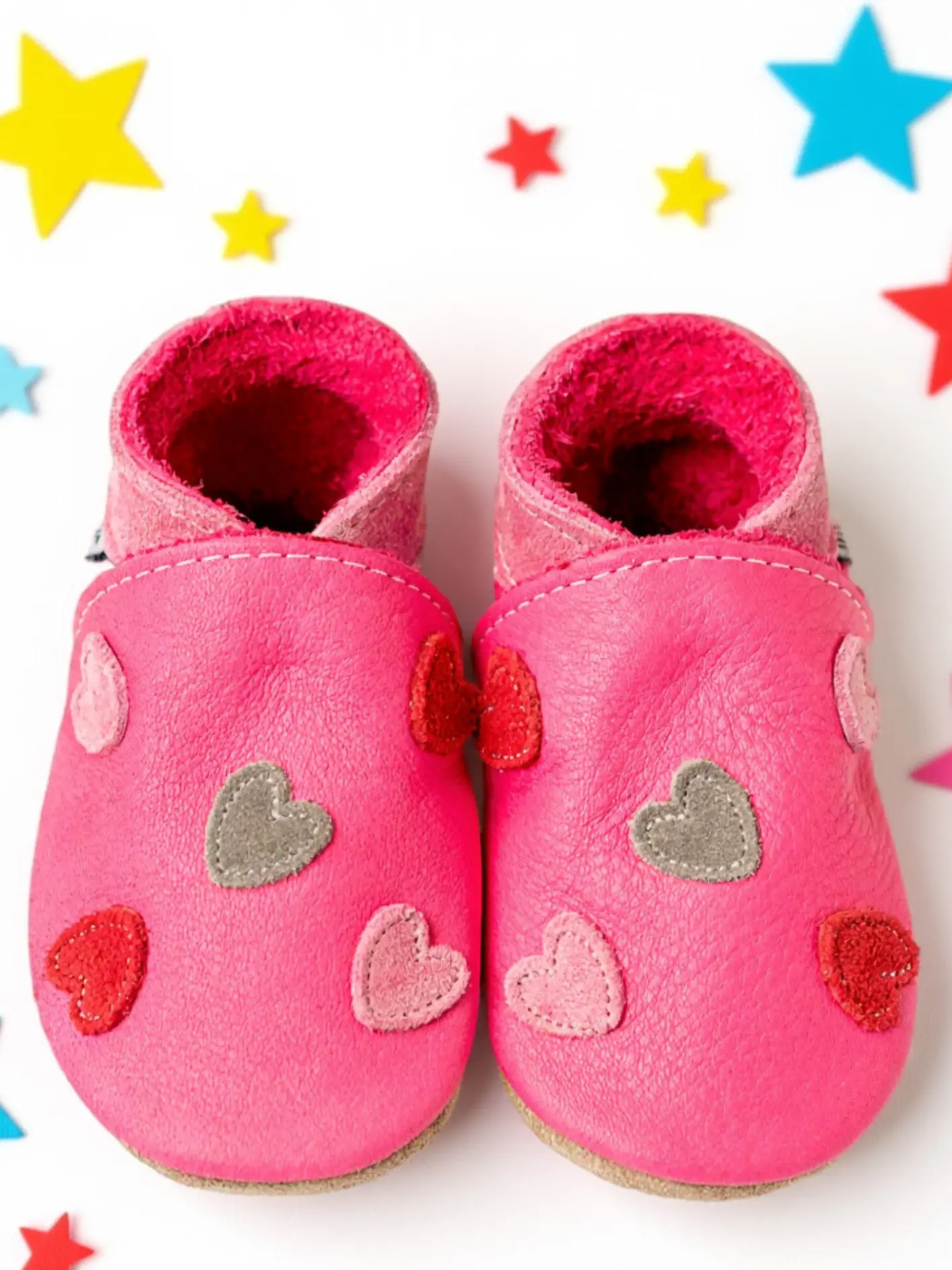 Introduce a vibrant touch to your little one's collection with these hot pink leather baby shoes. Crafted from soft, flexible leather, they prioritise comfort and ease for tiny feet. Each shoe features a sprinkle of heart motifs, presented in complementary shades of grey, pink, and red. This design offers a cheerful yet refined detail, making them a practical and stylish choice for various occasions while providing gentle support for your baby's early adventures.