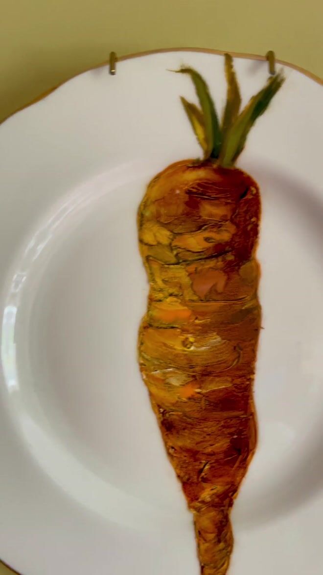 An original fine art painting featuring a carrot. Oil painting by renowned artist Jac Scott, on a vintage bone china tea plate...