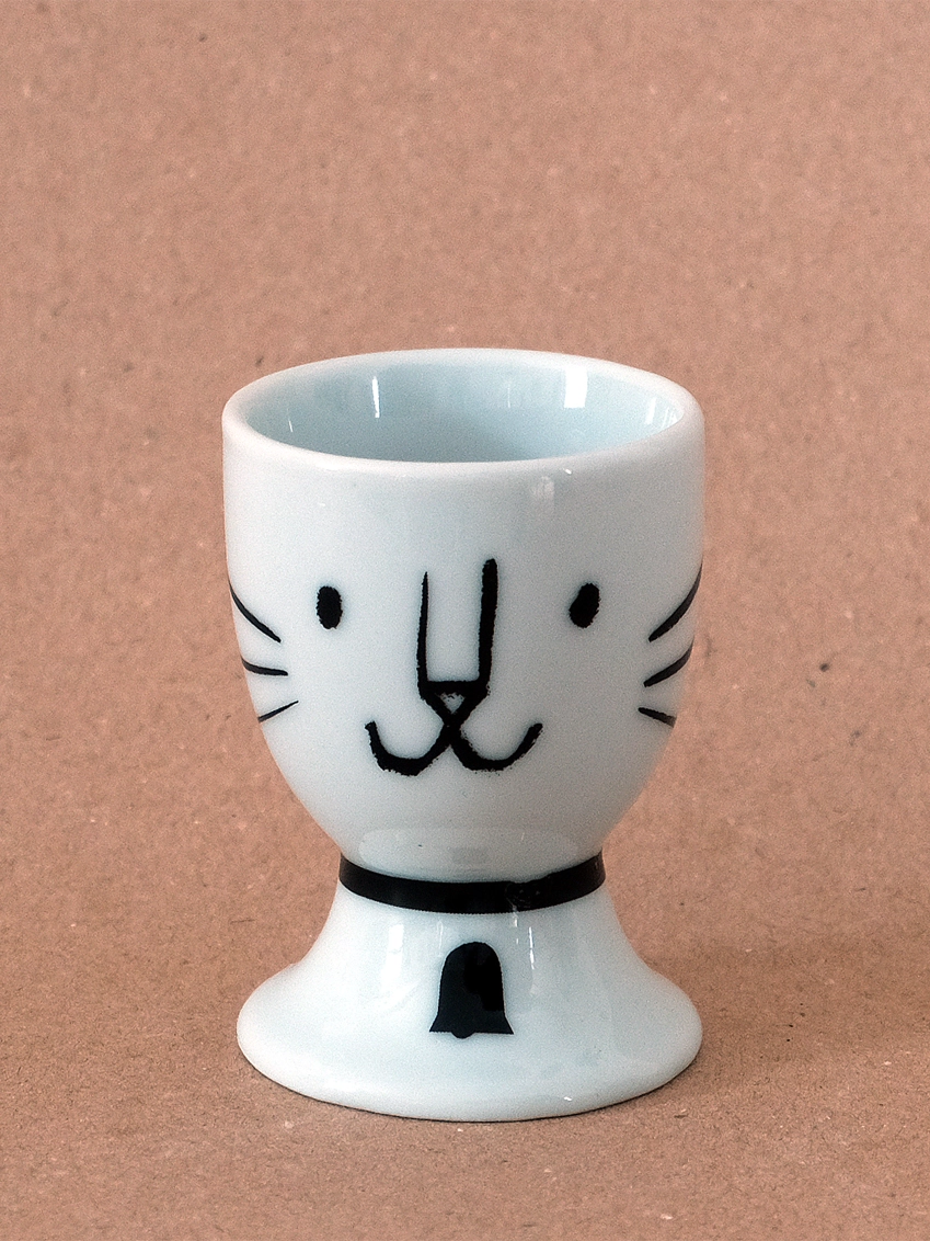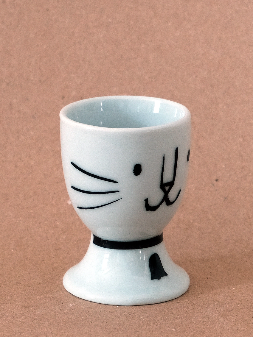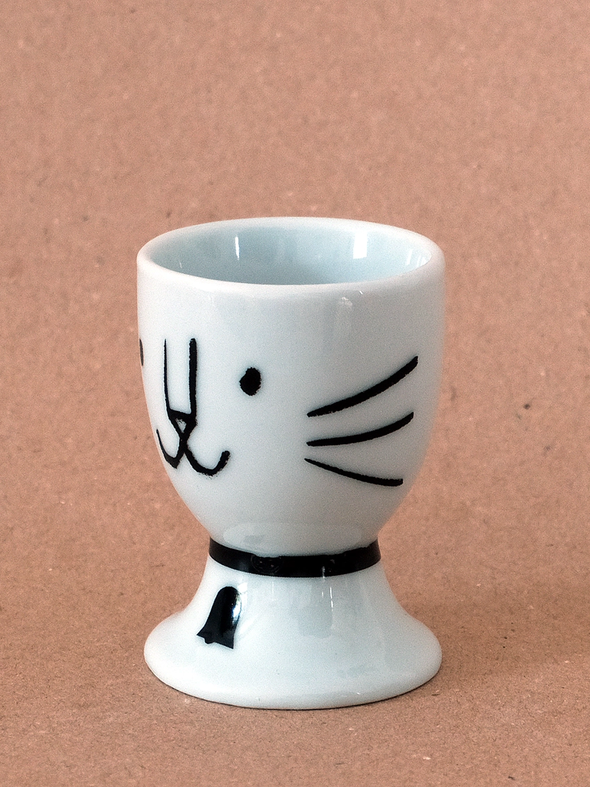 Our black and white, characterful egg cups are designed and printed by us. Stoneware.