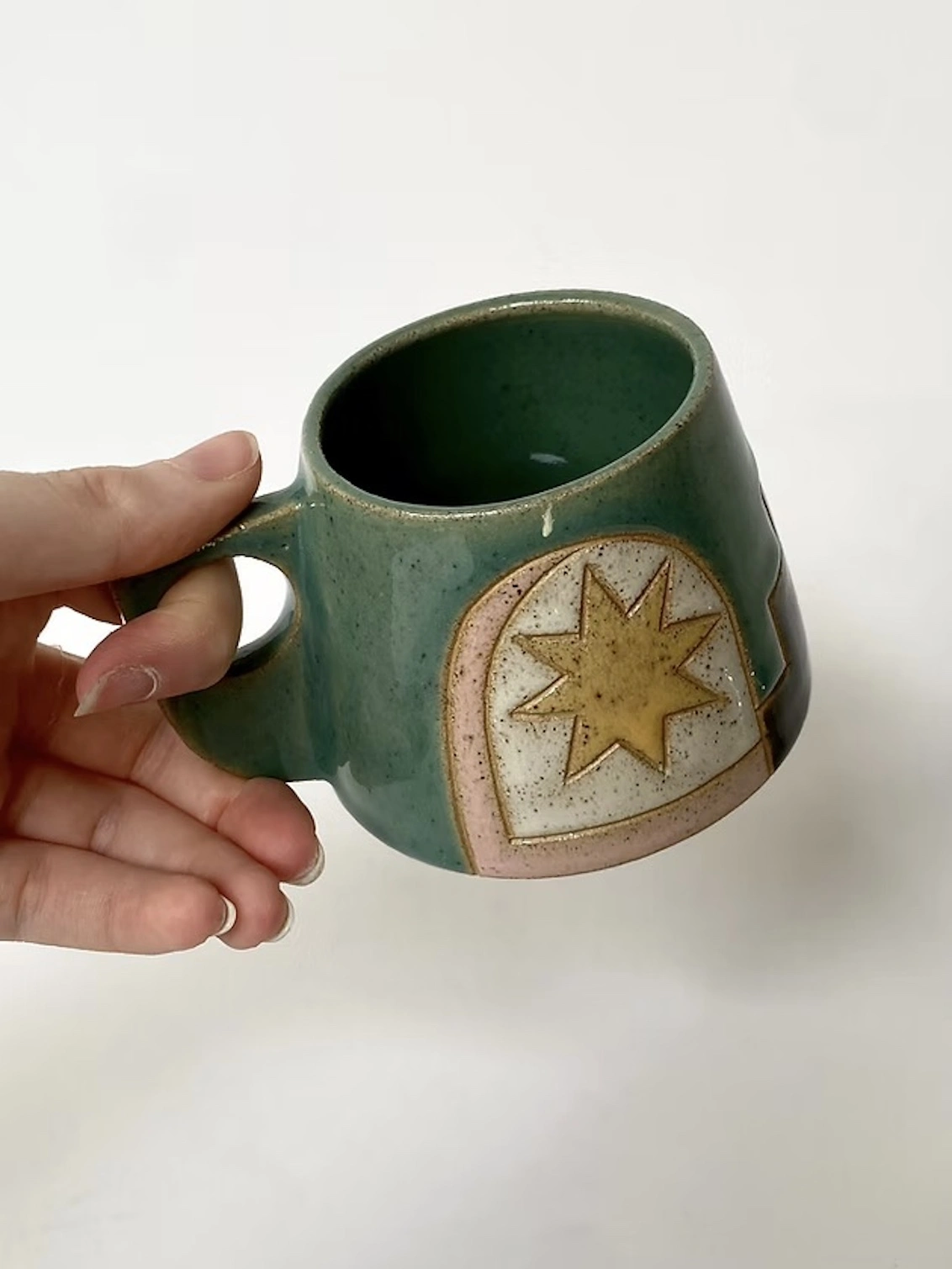 Handcarved and painted with a sun and moon design inspired by Moroccan architecture and tiles. Available in a green colourway.