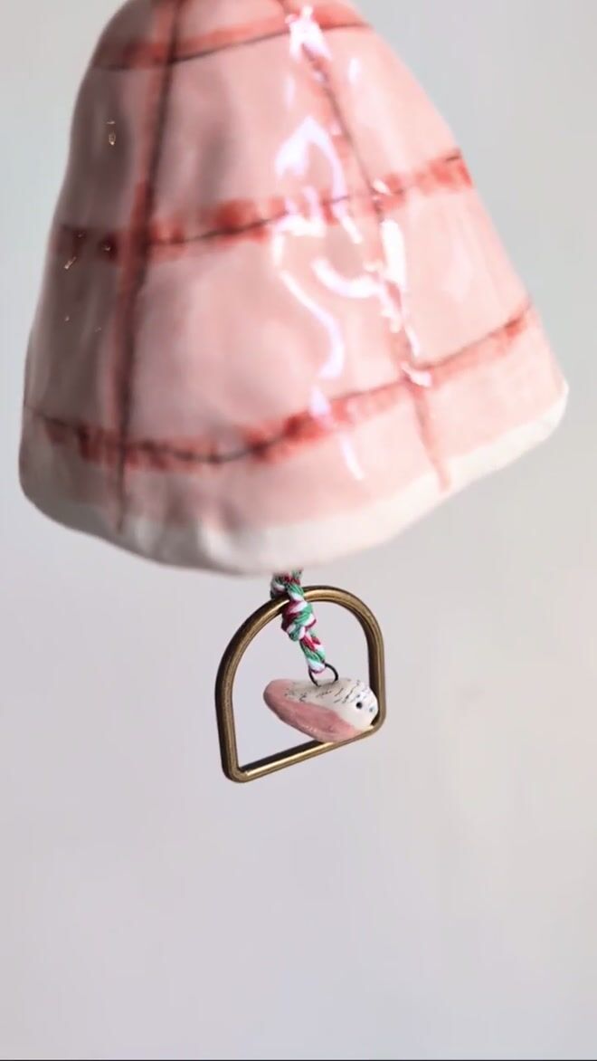 Handmade ceramic bird decoration or tree ornament with a pink, green or yellow budgie hanging beneath the hand pinched bell. They make a tinkling sound well gently rung. Please note DELIVERY DATE as made to ORDER.
