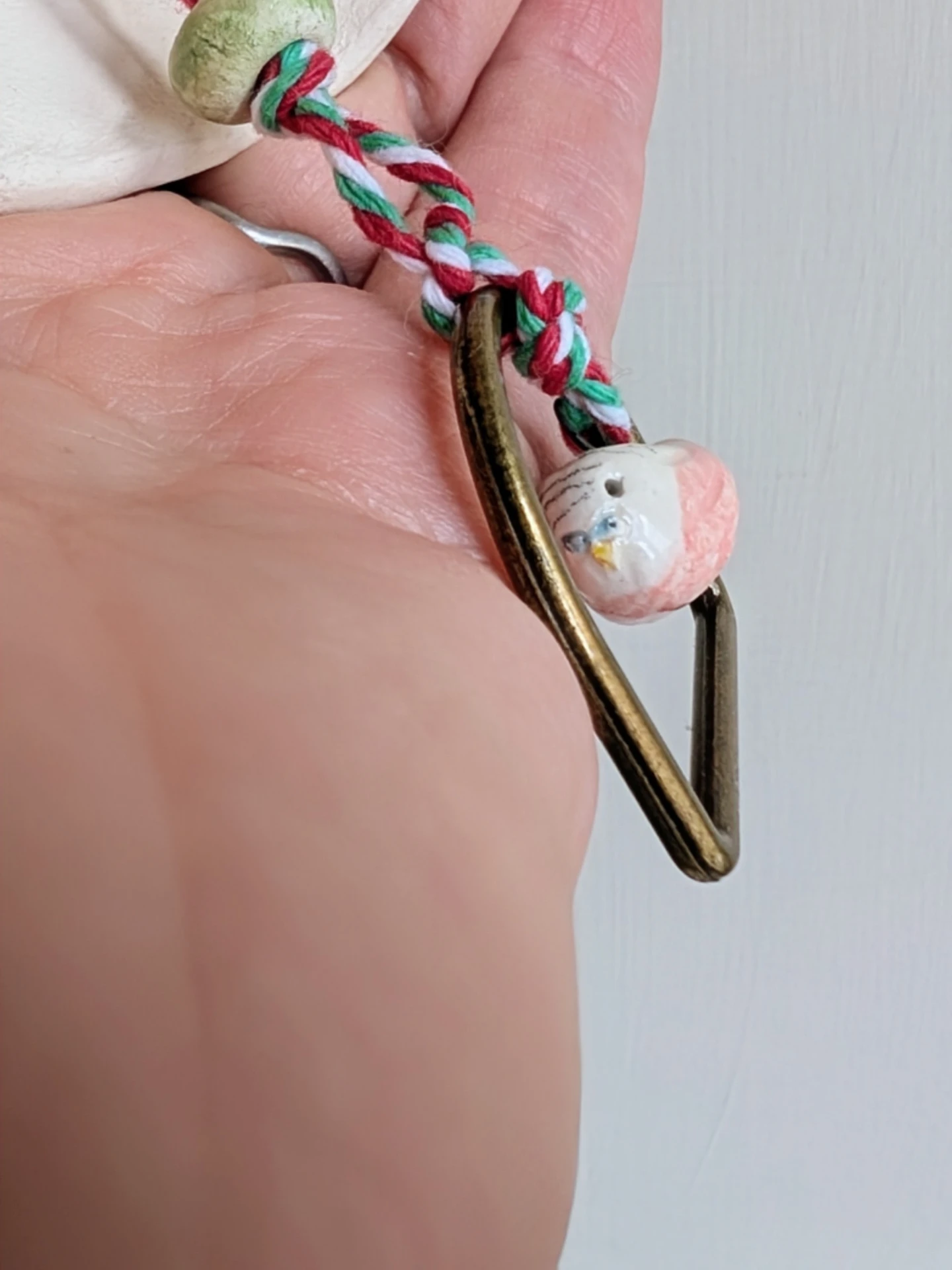 Each individual piece is handmade and then fired once before the final decoration and glaze firing. The pieces are then put together with coloured twine.