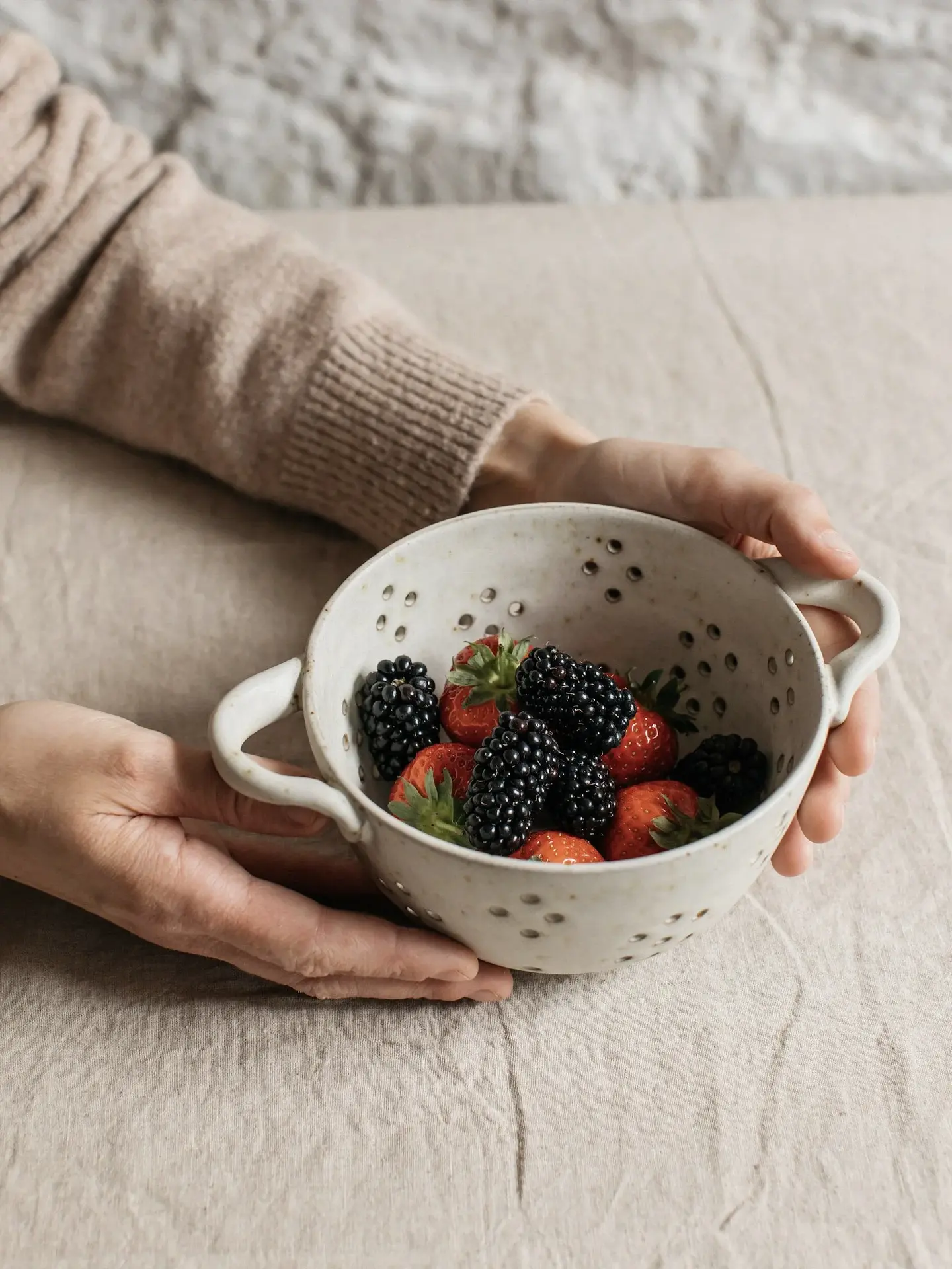 Ceramic stoneware berry bowl, made using a stoneware speckle clay and matt off-white glaze.