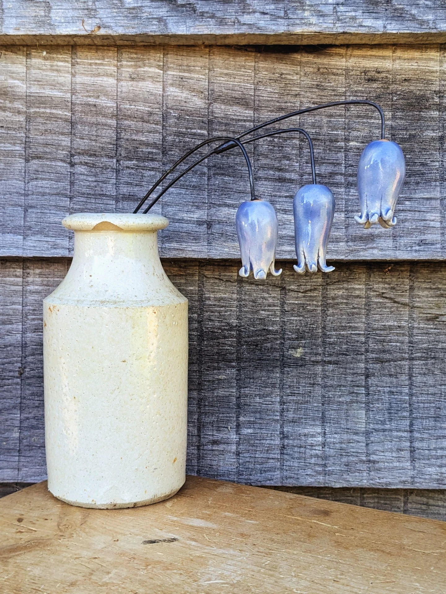 Ceramic bluebell wildflower stems, sold in a set of three flowers on two stems. Hand-sculpted in stoneware, fired, then glazed in periwinkle blue and re-fired. They are then affixed to wire and measure approximately 20 cm from top to bottom. Beautiful displayed singly, grouped, or with my stained glass stems. The ceramic flowers are sculptured freehand to replicate the variation seen in nature; as such your stem will differ slightly from the photos shown here.
