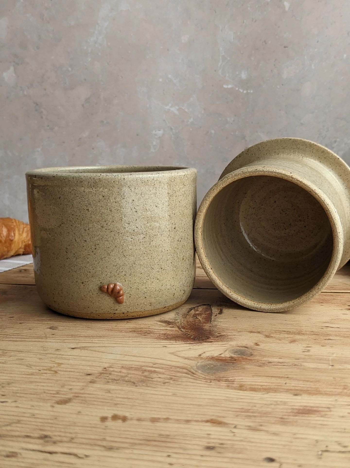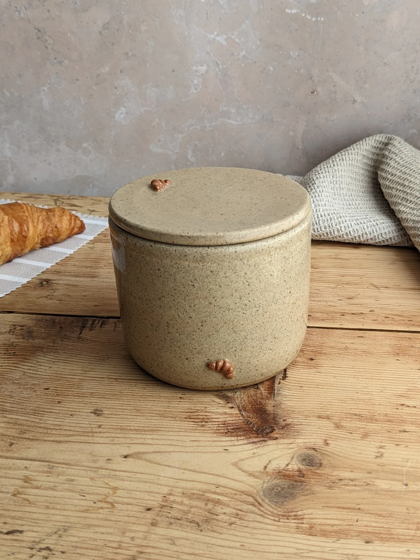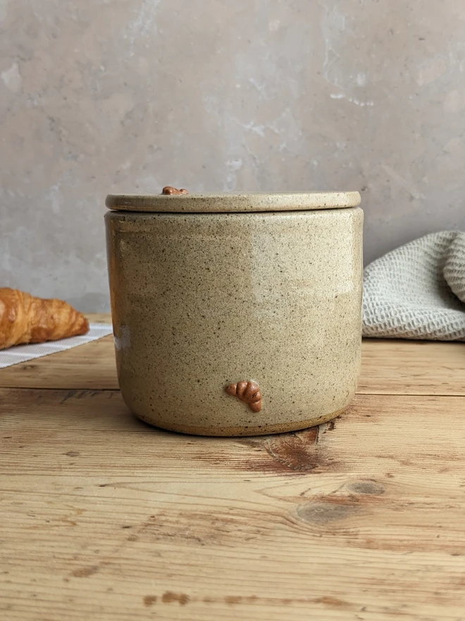 A handmade ceramic butter crock (or "butter keeper") with a mini croissant design. These are wheel-thrown and made from speckled, biscuit-coloured stoneware clay and with 2 handmade and hand-painted mini croissants. These are truly unique and a perfect addition to your breakfast table for those Sunday morning croissants!